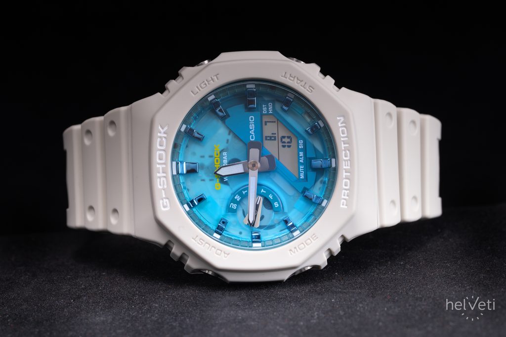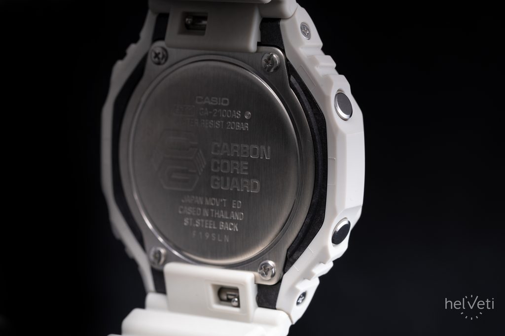 The Casio G-Shock GA-2100AS-5AER with Carbon Core Guard construction is an addition to the popular GA-2100 series, which is characterized by an octagonal case.