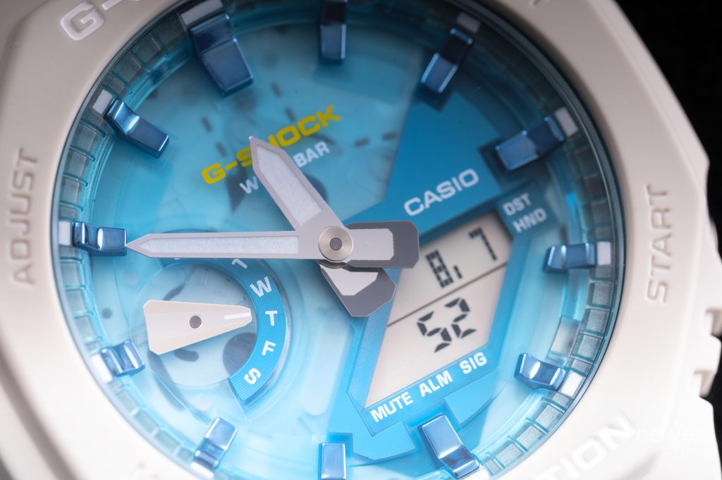 Casio G-Shock GA 2100AS-5A evokes summer with its colours. Their semi-transparent dial is inspired by the colour of the cool blue waters of an oasis under the heat of the summer sun. Even the new design does not change the watch's craftsmanship, which can withstand exposure to difficult conditions. The high durability of the case is ensured by the Carbon Core Guard construction. This is made of resin, reinforced and strengthened with carbon fibers, the construction of the buttons is also special, protecting the model from the penetration of dirt. The aforementioned combination allows to create a more compact and lighter unit.