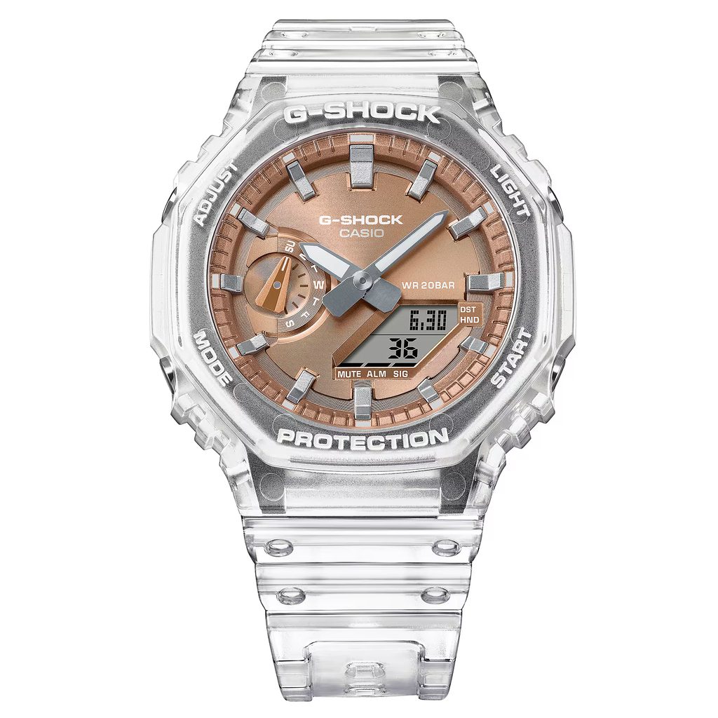 Casio G-Shock GA 2100BM-7A5 brings the popular metallic dials combined with the popular transparent case and bracelet. The new design doesn't change the craftsmanship of the watch, which will stand up to exposure to harsh conditions. The high durability of the case is ensured by the Carbon Core Guard construction. This is made of resin, reinforced and strengthened with carbon fibers, the construction of the buttons is also special, protecting the model from the penetration of dirt. The aforementioned combination allows to create a more compact and lighter unit.