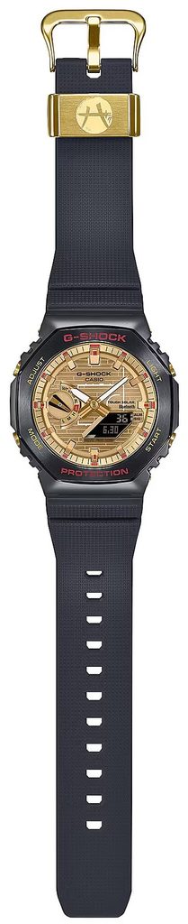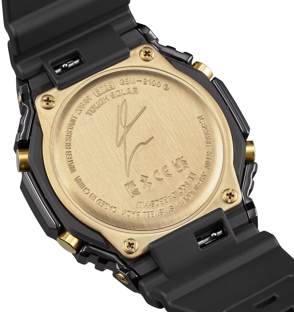 The central motif of the watch is a gold dial representing a basketball court. The black and gold watch features accentuating red elements. Red is the G-SHOCK brand colour and also represents Hachimura's passion for the game.