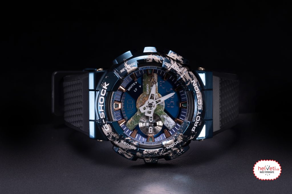 Casio G-Shock GM-110EARTH-1AER Planet Earth is a sports watch from the GM-110 series, which now offers cases with steel elements. Thanks to its features and durability, the watch will be appreciated for sports, outdoor and leisure activities. All functions are easy to use thanks to the combined analogue and digital dial. The construction combining steel and plastic gives the watch a still light weight, so it is comfortable to wear despite its larger size. In addition, it is very durable and can withstand even rough handling.