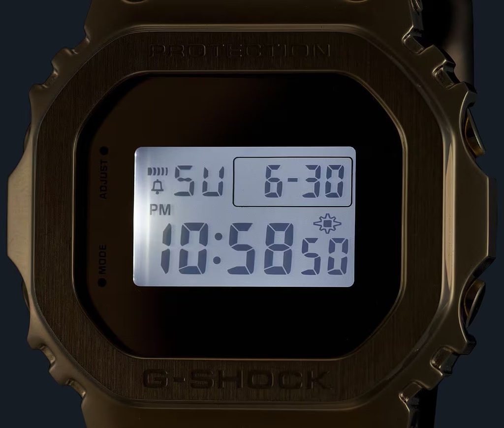 Casio G-Shock GM 5600YMG-9 have a digital display that shows the date, day of the week, stopwatch, alarm and many other functions. The durable case, consisting of a plastic core and steel case with gold IP surface treatment, is complemented by a durable and maintenance-friendly metallic gold silicone strap.