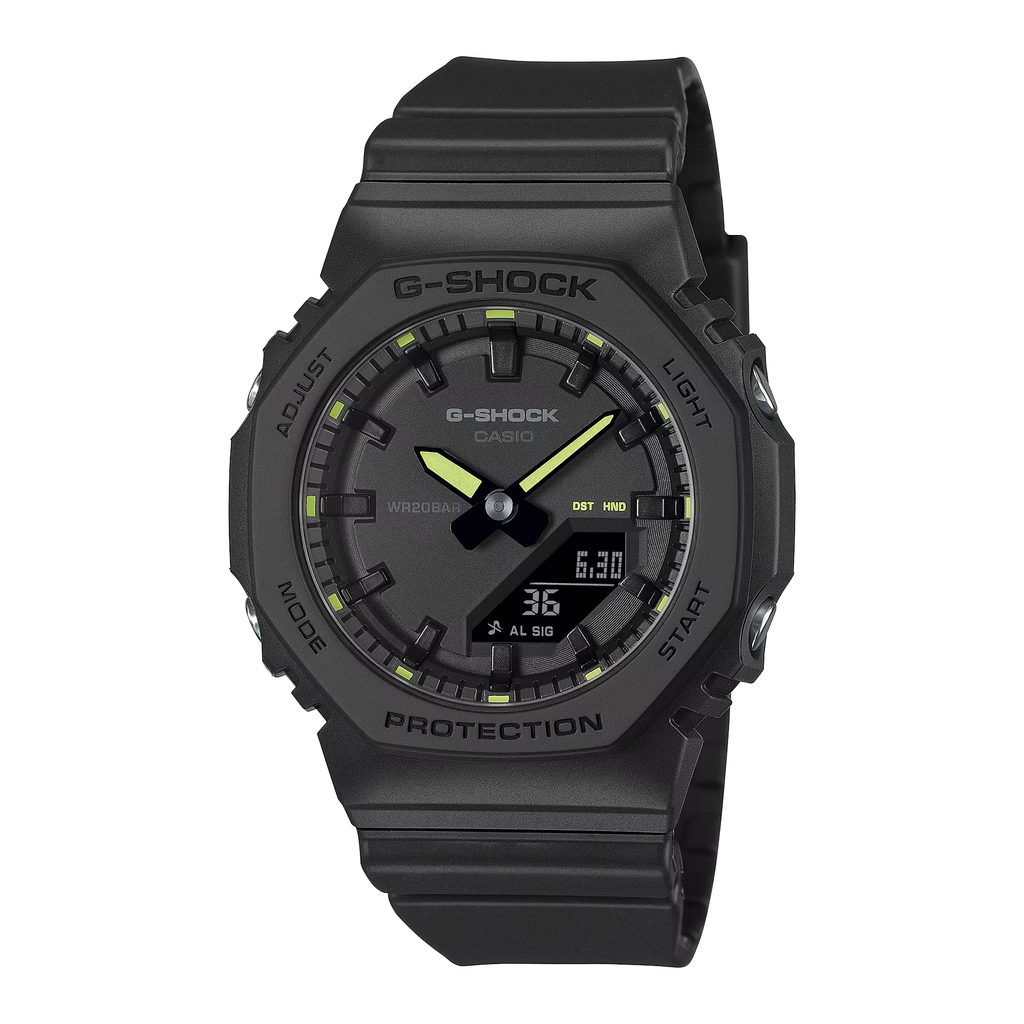 The GMA-P2100 models fit even better on petite women's wrists. Compared to the GMA-S2100 collection, the GMA-S2100 has a smaller case diameter of 40.2 mm and a shorter strap. To achieve a minimalist look, the sub-dial has been removed from the 9 o'clock position. A digital display provides all the necessary data. The watch can withstand exposure to difficult conditions. The case is made of renewable resin and complete with metal control buttons.