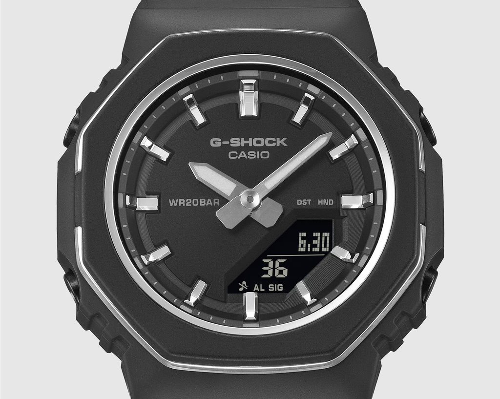 The GMA-P2110 models maintain a compact size and shortened strap, making it a better fit for smaller women's wrists. An interesting feature is the octagonal lunette, made up of two parts. The top one has a matte finish and is surrounded by a shiny metal ring. This light-catching element adds an elegant accent to the clean and simple design.