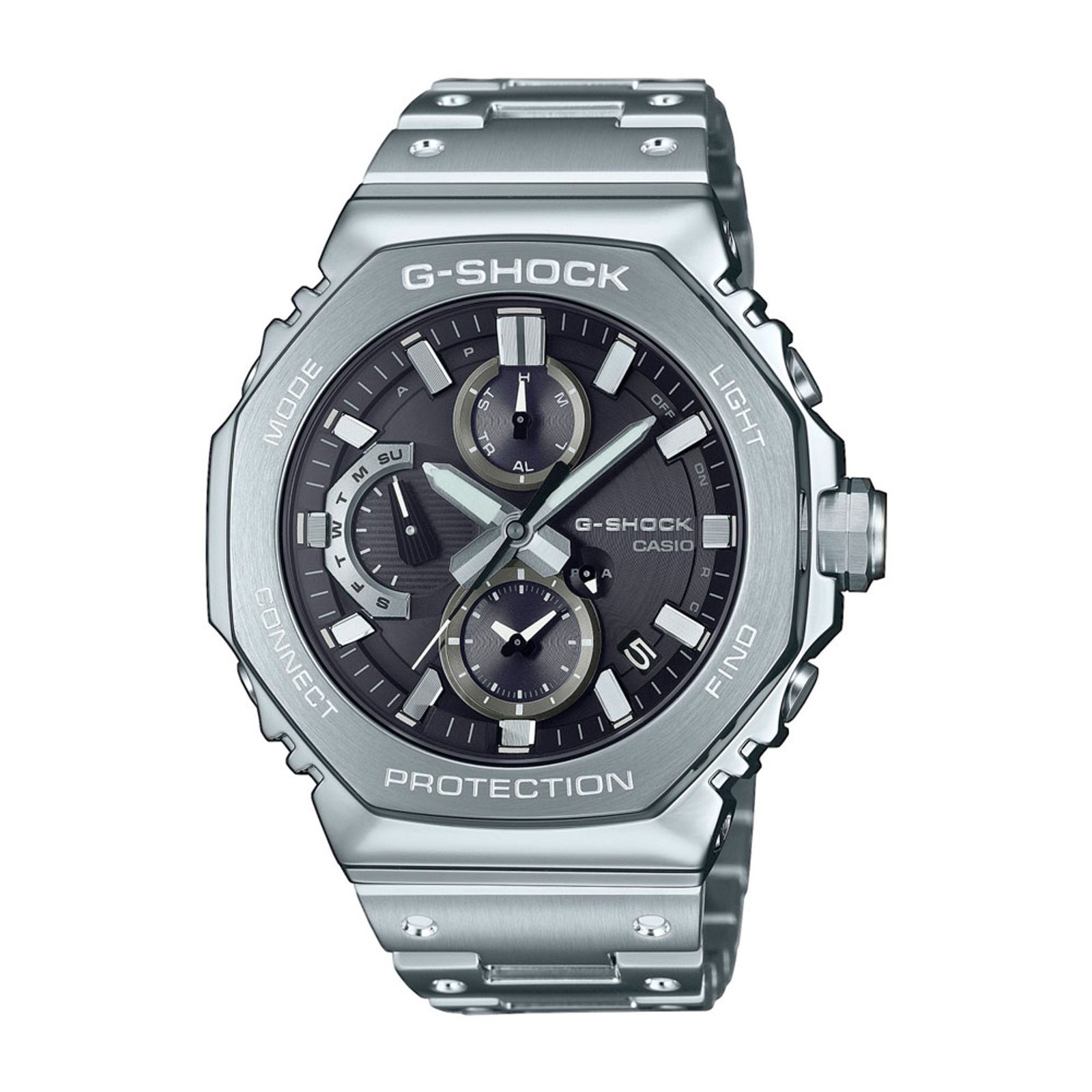 The popular G-Shocks with the iconic case shape now in an all-steel design, analog dial only, stopwatch function and solar powered.