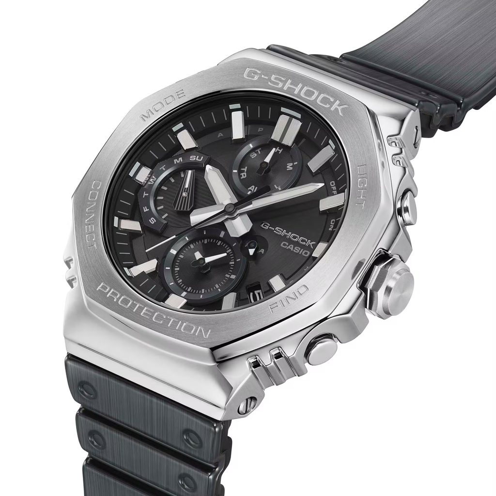 The popular G-Shocks with the iconic case shape now in an all-steel version, with analogue dial only, stopwatch function and solar power.