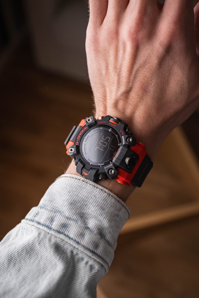 Casio G-Shock Mudman GW 9500-1A4 has a digital display that shows the date, day of the week, stopwatch, alarm and many other functions that you will find particularly useful in the outdoors, which include a compass showing magnetic north, an altimeter with a range of -700 to 10,000 m, a barometer with the ability to record pressures of 260 to 1100 hPa and a thermometer measuring in the range -10 to 60°C, sunrise and sunset times and other information associated with the use of the respective functions.