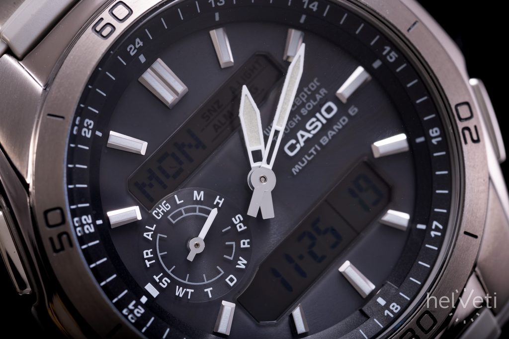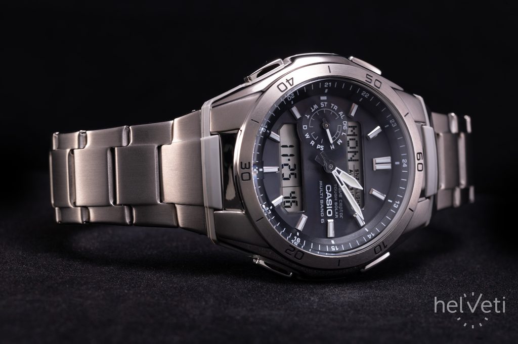 Casio WVA M650TD-1A has a combined dial (analogue and digital) that displays the date, stopwatch, alarm or automatic calendar. The time is synchronized via radio signal, which guarantees the watch's absolute accuracy, and it is recharged via solar power. With a case diameter of 43 mm, it is one of the larger watches in terms of size. As the case is made in a combination of titanium and high-quality plastic, the watch is also very light. The water resistance of this model is 100M.