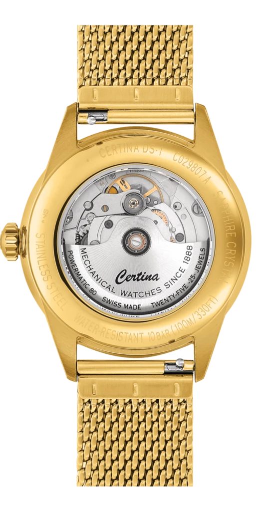 The Certina C029.807.33.361.00 ispart of the DS-1 model series. The detailed dial is protected by a scratch-resistantsapphire crystal. The glass is coated with an anti-reflective layer on one side, which allows the time to be read smoothly even in direct sunlight. The watch case is made of stainless steel in gold PVD finish, and is held on the wrist by a braided steel bracelet, also in gold PVD finish. The water resistance of the watch is 100m, making it suitable for swimming and light diving.