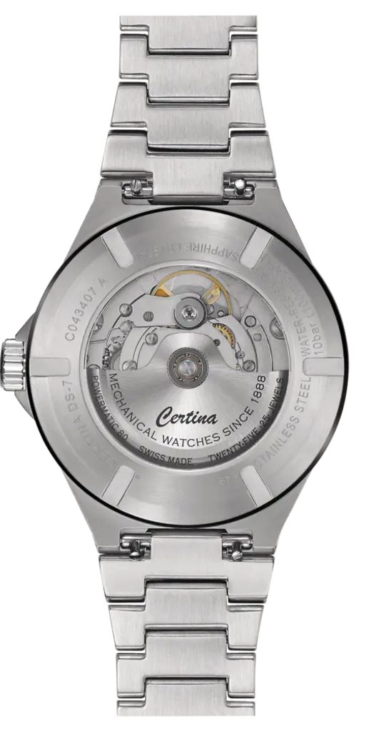 Like all Certina watches, it is equipped with the unique DS technology (Double Security System), which increases the durability, shock resistance and water resistance reliability of the watch (1. reinforced sapphire crystal, 2. seal on the crown shaft, 3. double seal on the crown, 4. special back cap seal, 5. reinforced back cap).