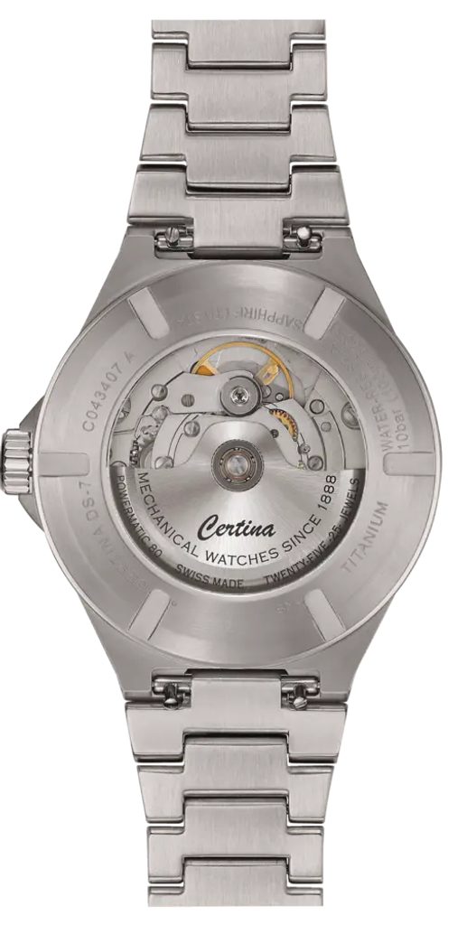 Like all Certina watches, it is equipped with the unique DS technology (Double Security System), which increases the durability, shock resistance and water resistance reliability of the watch (1. reinforced sapphire crystal, 2. seal on the crown shaft, 3. double seal on the crown, 4. special back cap seal, 5. reinforced back cap).
