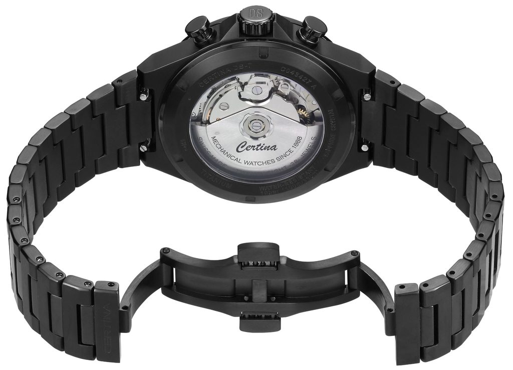 Like all Certina watches, it is equipped with the unique DS technology (Double Security System), which increases the durability, shock resistance and water resistance reliability of the watch (1. reinforced sapphire crystal, 2. seal on the crown shaft, 3. double seal on the crown, 4. special back cap seal, 5. reinforced back cap).