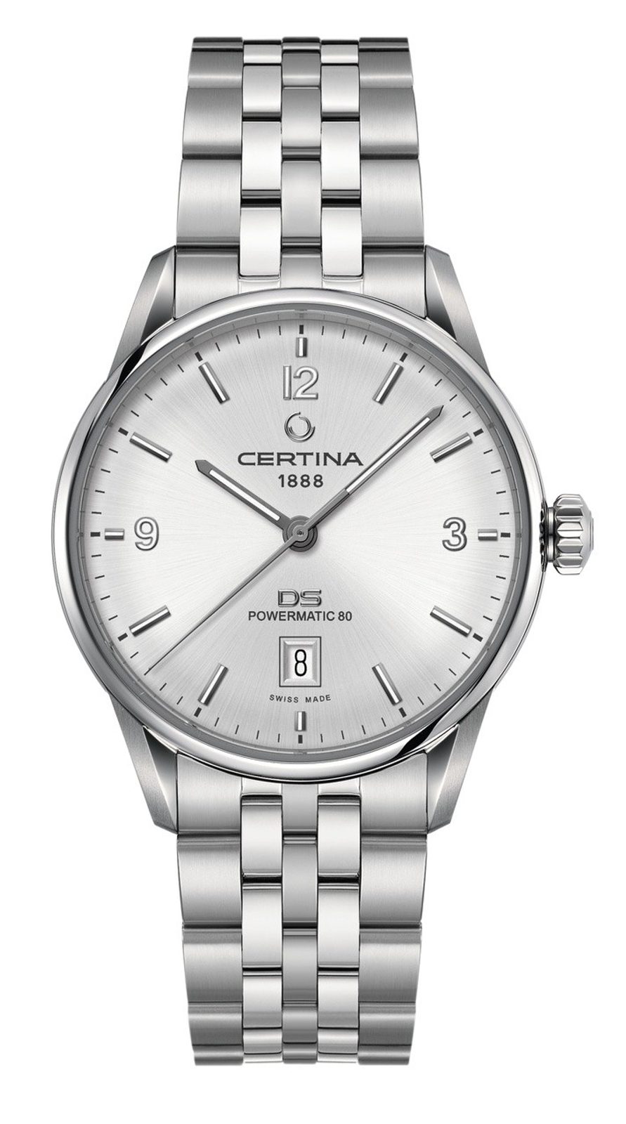 TheCertina C026.407.11.037.00 watch, part of the DS Powermatic 80 series , features a date display. Thedetailed dial is protected by a scratch-resistant anti-reflective sapphire crystal. The watch case is made of stainless steel, including the movement. The water resistance of the watch is 100m, making it suitable for swimming and light diving.