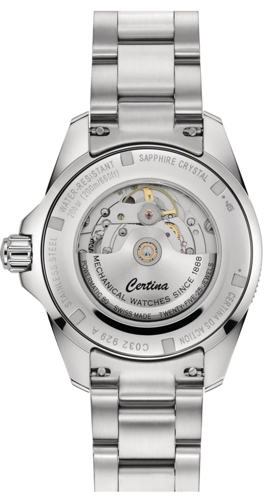 Like all Certina watches, it is equipped with the unique DS technology (Double Security System), which increases the durability, shock resistance and water resistance reliability of the watch (1. reinforced sapphire crystal, 2. seal on the crown shaft, 3. double seal on the crown, 4. special back cap seal, 5. reinforced back cap).