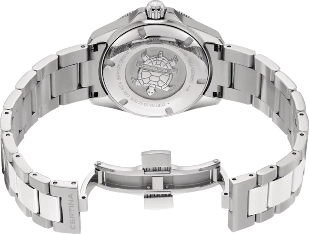 Like all Certina watches, it is equipped with the unique DS technology (Double Security System), which increases the durability, shock resistance and water resistance reliability of the watch (1. reinforced sapphire crystal, 2. seal on the crown shaft, 3. double seal on the crown, 4. special back cap seal, 5. reinforced back cap).
