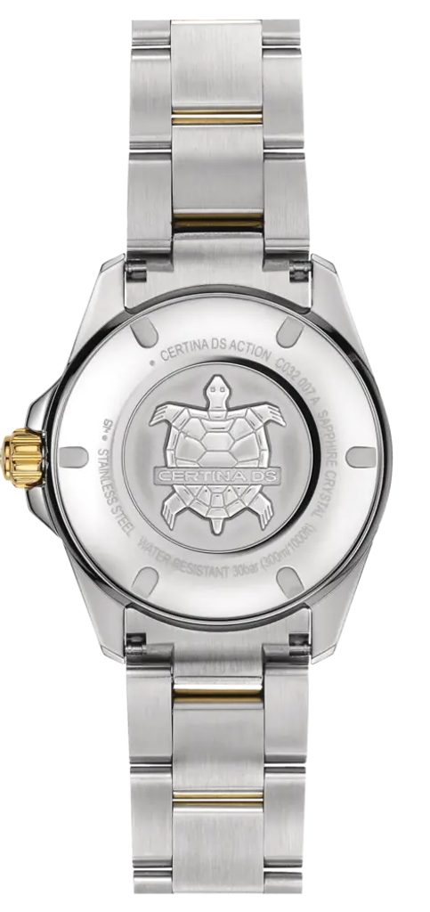 Like all Certina watches, it is equipped with the unique DS technology (Double Security System), which increases the durability, shock resistance and water resistance reliability of the watch (1. reinforced sapphire crystal, 2. seal on the crown shaft, 3. double seal on the crown, 4. special back cap seal, 5. reinforced back cap).