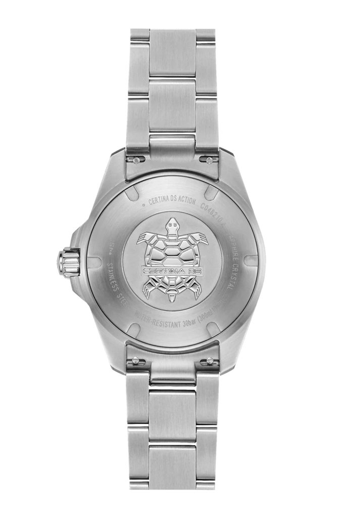 Like all Certina watches, it is equipped with the unique DS technology (Double Security system), which increases the durability, shock resistance and water resistance reliability of the watch (1. reinforced sapphire crystal, 2. seal on the crown shaft, 3. double seal on the crown, 4. special back cap seal, 5. reinforced back cap).