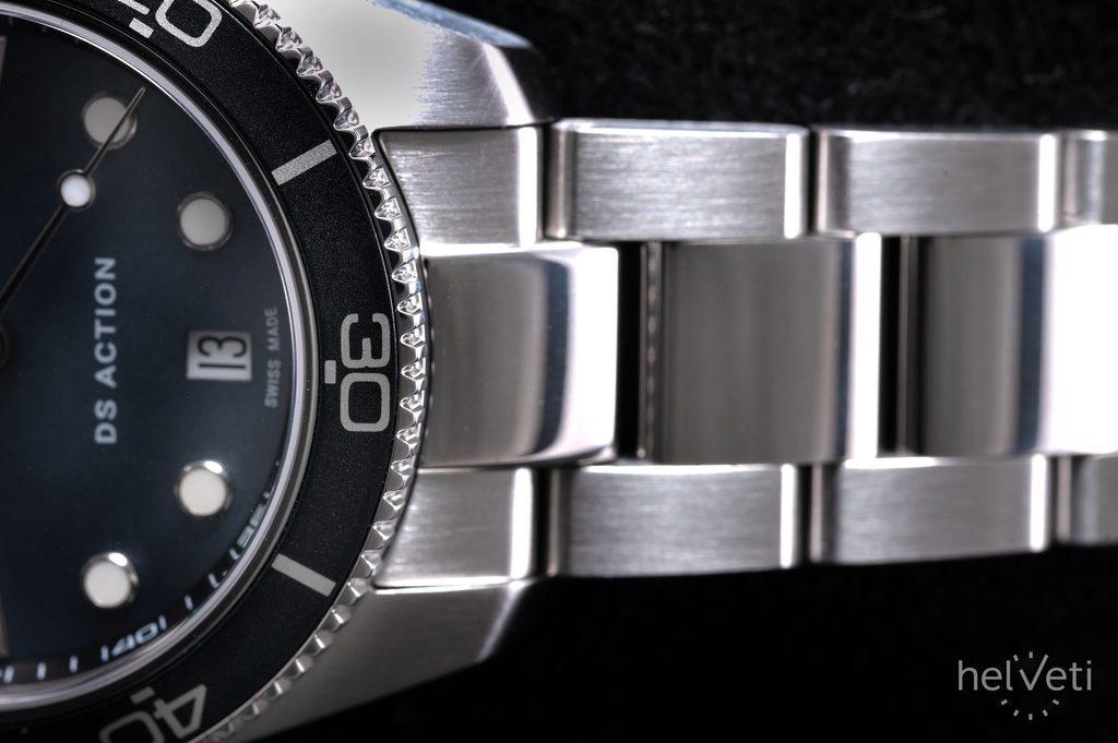 The watch case is made of stainless steel and is held on the wrist by a bracelet made of the same material. The model has a water resistance of 300M, so it is suitable for swimming and diving. Thanks to the diver's lunette with aluminium insert, this watch further emphasises its diving style.
