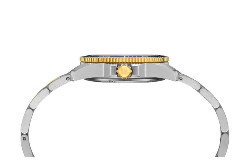 The watch case is made of stainless steel and is held on the wrist by a bracelet made of the same material. Both the case and the bracelet are partially finished in PVD gold. The model has a water resistance of 300M, so it is suitable for swimming and diving. Thanks to the diver's lunette with aluminium insert, this watch further emphasises its diving style.