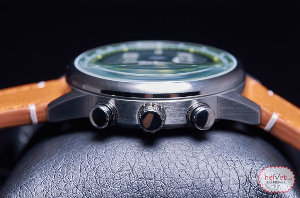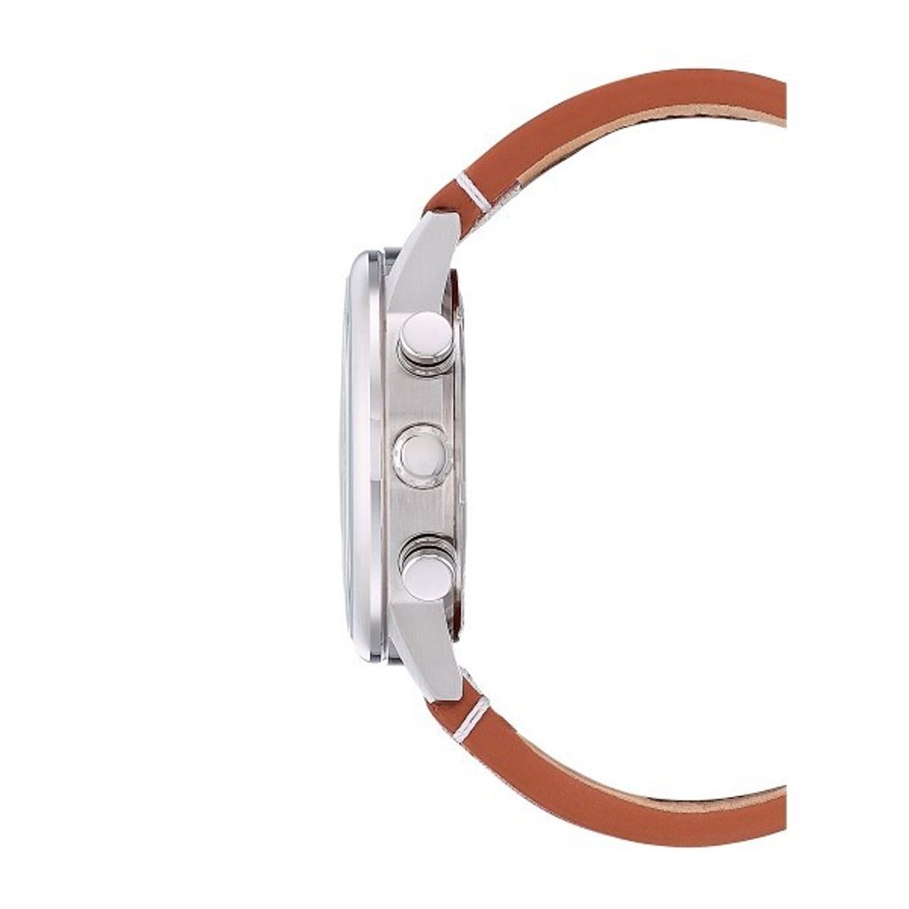 The Citizen CA4420-21X has a case made of stainless steel, which is complemented by a leather strap. This case holds the in-house Citizen B620 movement, which features a light rechargeable battery with running reserve of up to 9 months and also has a discharge indicator battery function. Other features include a stopwatch, a twenty-four hour sub-dial and a date display at the 4-5 o'clock position. An interesting feature of the stopwatch is the smooth operation of the second hand, which allows the time to be measured with 1/5 s accuracy.