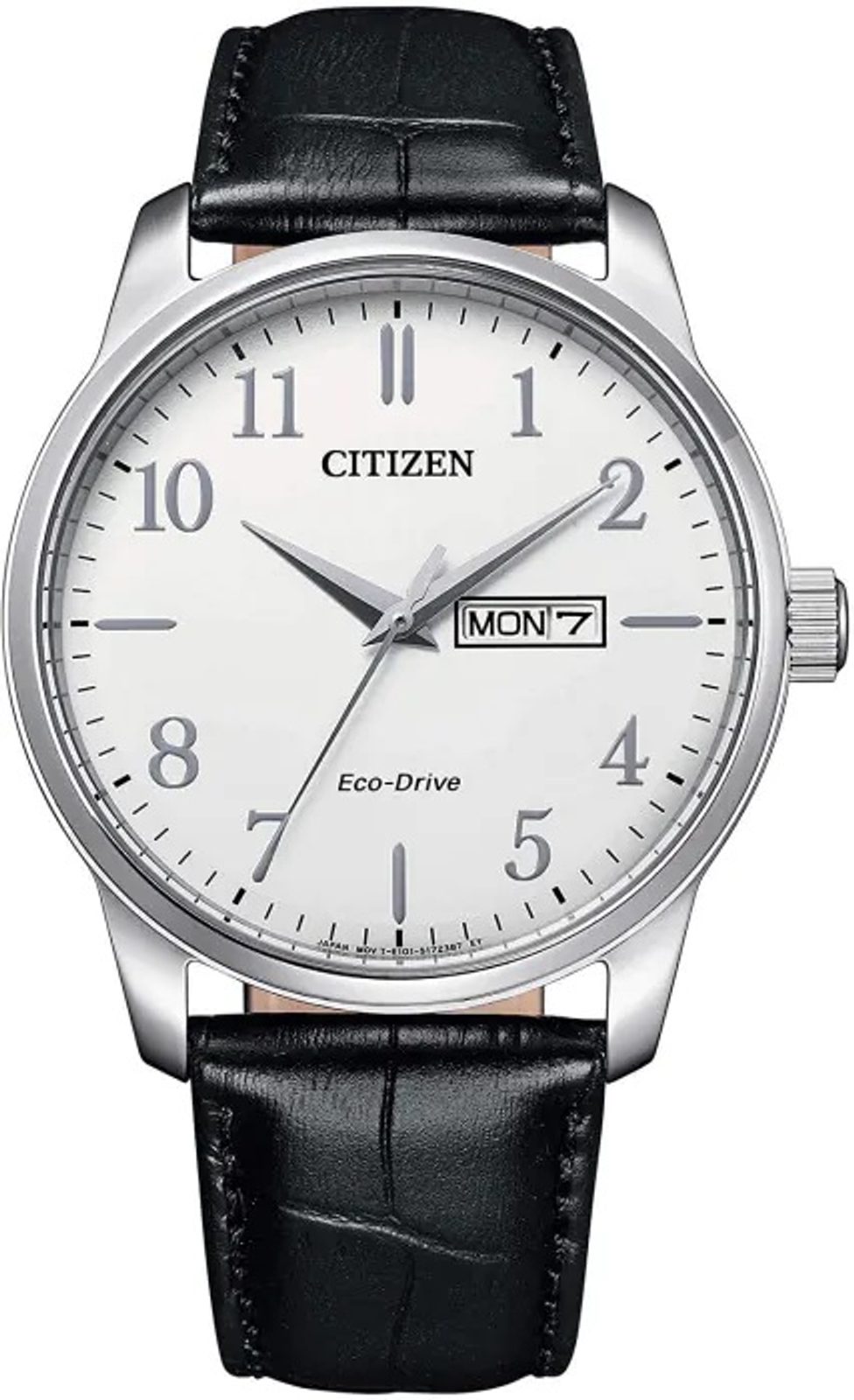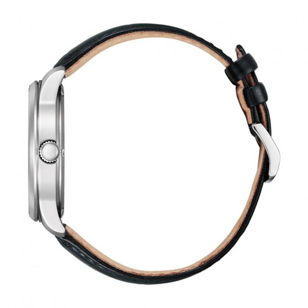 The case of the Citizen BM8550-14AE is made of stainless steel and is complemented by a leather strap. Inside the case, the in-house movement Citizen E101 works reliably, which has a light-charged battery with a power reserve of up to 6 months and also a battery discharge indicator function by jumping the second hand after 2 seconds. A handy feature is then the date and day of the week display at the traditional 3 o'clock position.