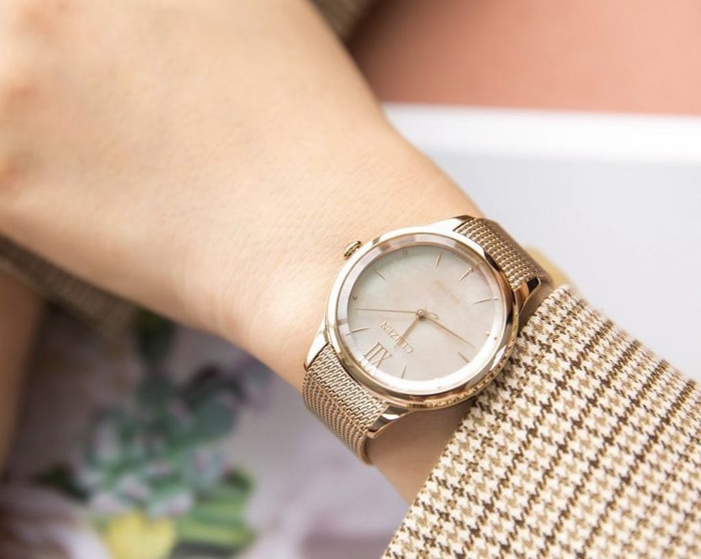 The Citizen EM0813-86Y watch has a case, including the bracelet, made of stainless steel with a PVD coating in rose gold. Inside the case, the in-house Citizen E031 movement works reliably, featuring a light rechargeable battery with a power reserve of up to 6 months and also has a discharge indicator battery function.