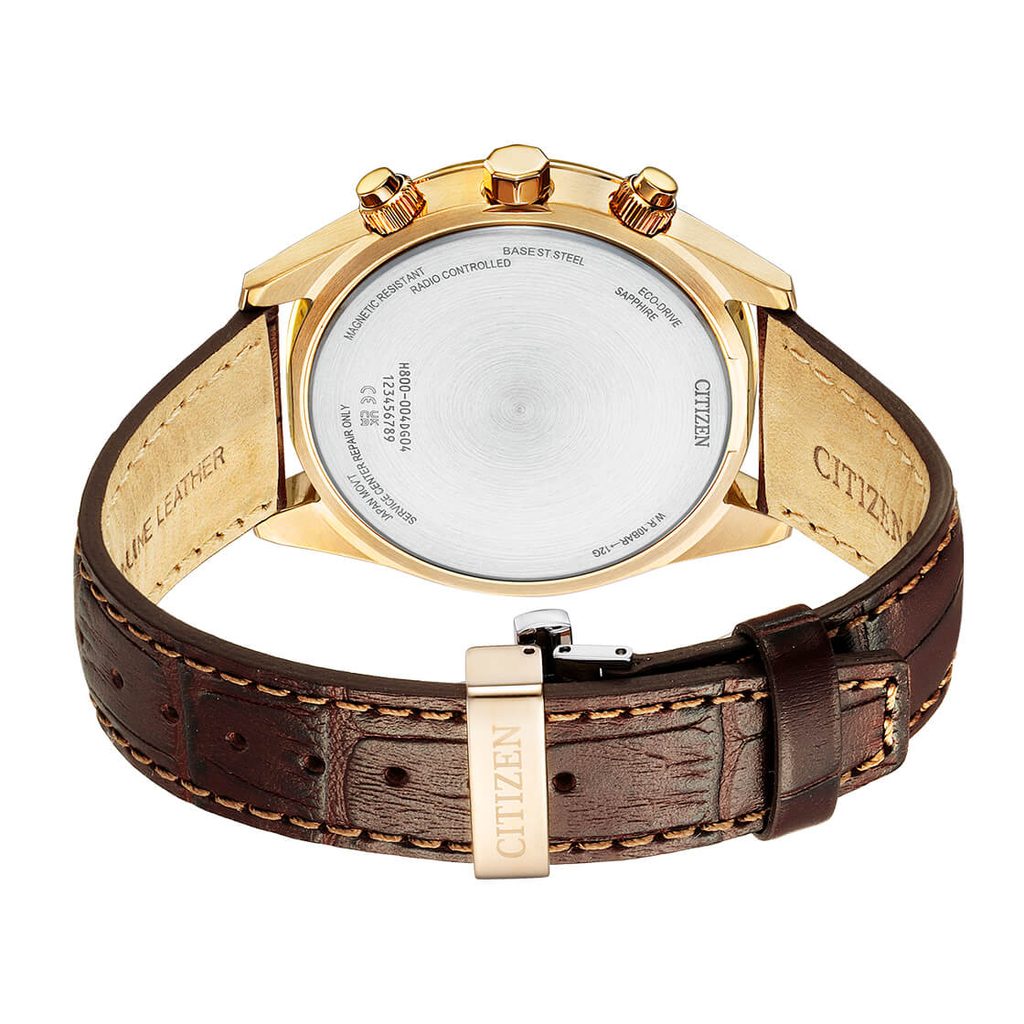 The case of the Citizen AT8263-10H is made of stainless steel with a rose gold PVD finish, complemented by a leather strap. Inside this case works the Citizen H800 movement, which offers absolutely accurate time thanks to the Radio-Controlled system, i.e. synchronization of time using a radio signal. You can also rely on other functions, such as battery indication, preventing overcharging, warning when the battery is undercharged with two-second jumps of the second hand, or switching to power-saving mode. You can also use the stopwatch function with an accuracy of 1/20 s, or the 24-hour sub-dial at the 9 o'clock position. Very practical is the date and day of the week display.