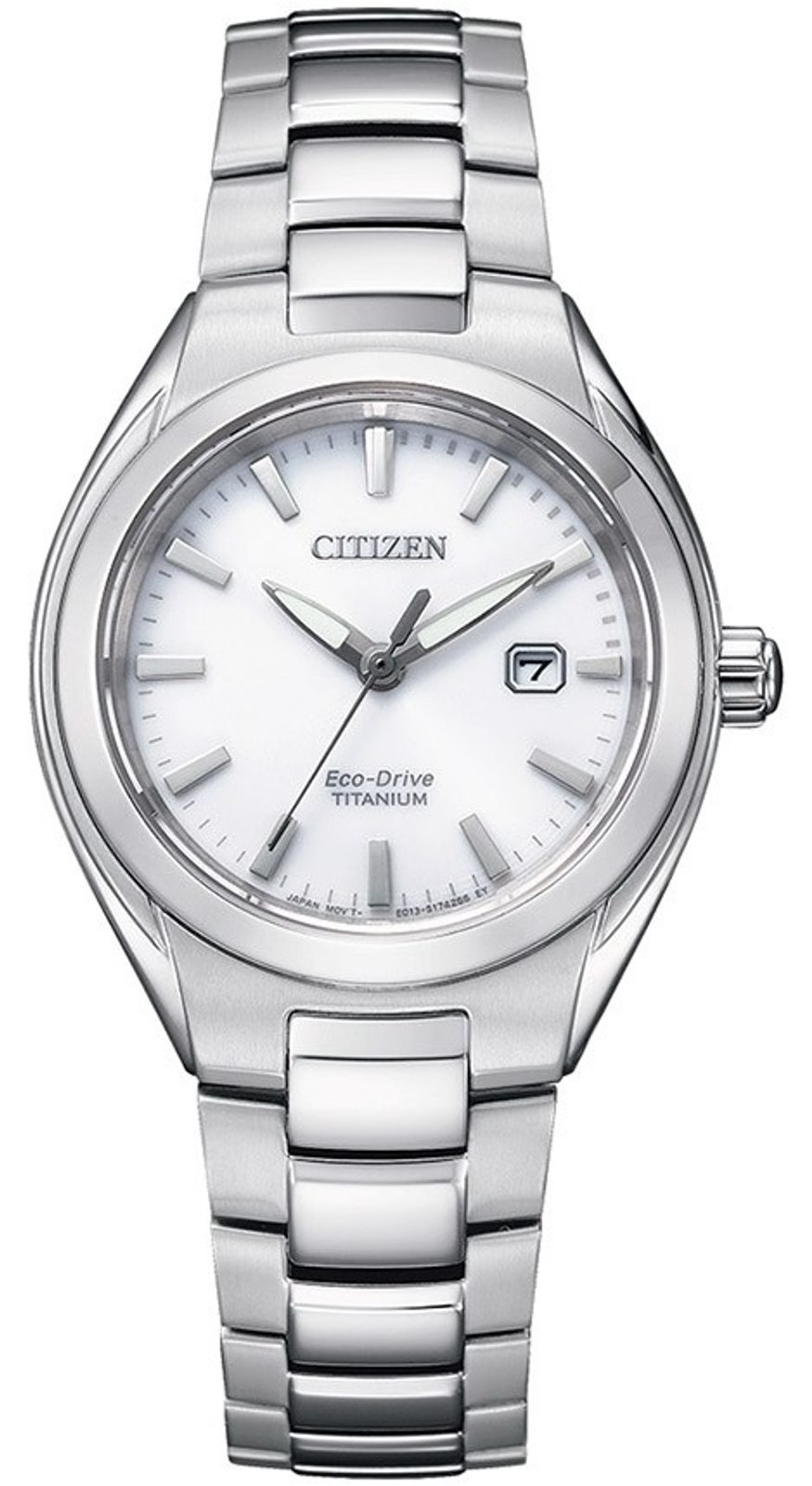 The Citizen EW2610-80A watch has a case and bracelet made of Super Titanium™, which guarantees low weight, high strength and complete anti-allergy properties. Thanks to a special hardening method, the surface of this titanium is more scratch-resistant than stainless steel. Inside the case, the in-house Citizen E013 movement operates reliably, featuring a light rechargeable battery with a power reserve of up to 6 months and also has a low battery indicator function. At position 3 we find a handy date display.