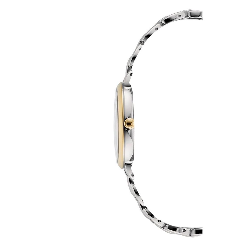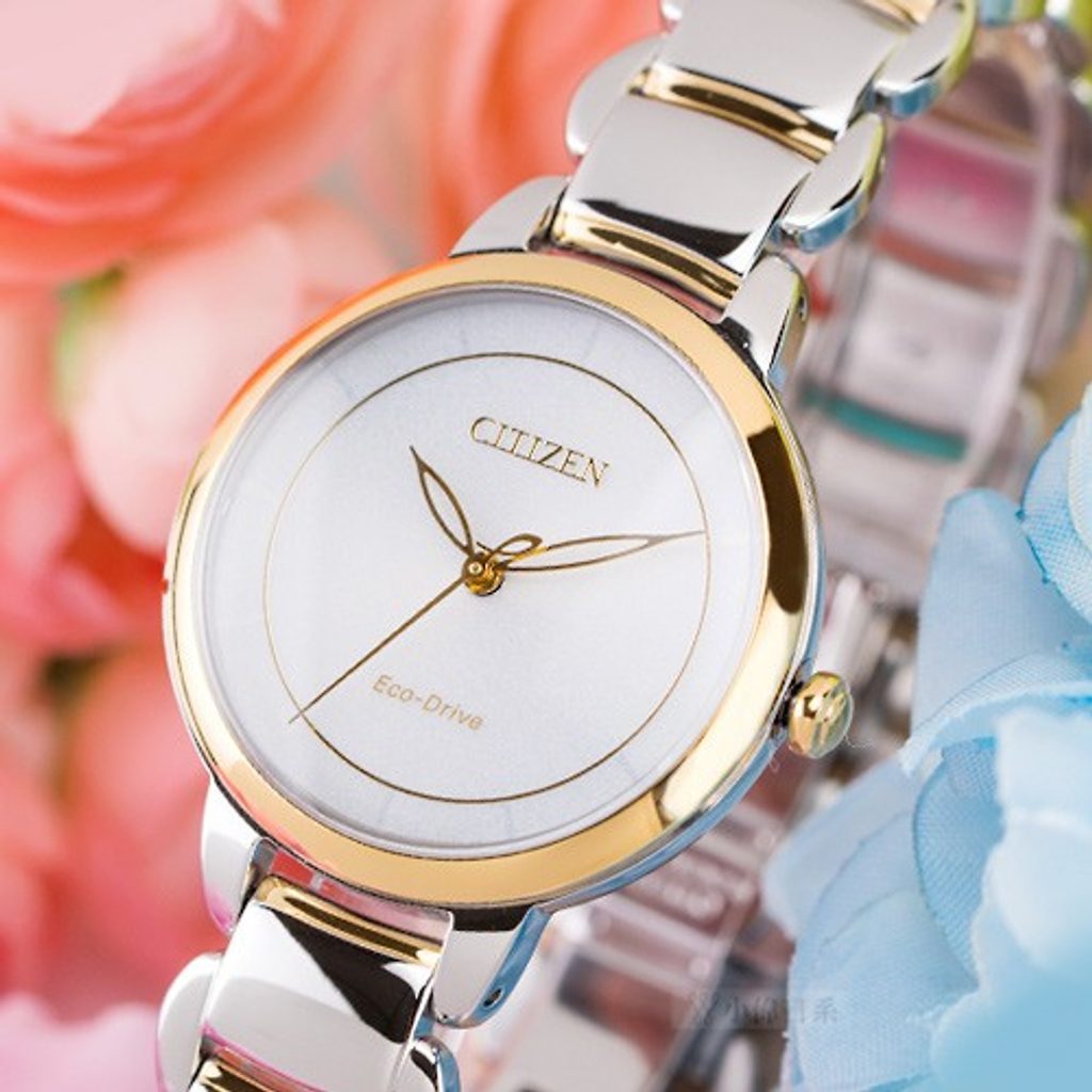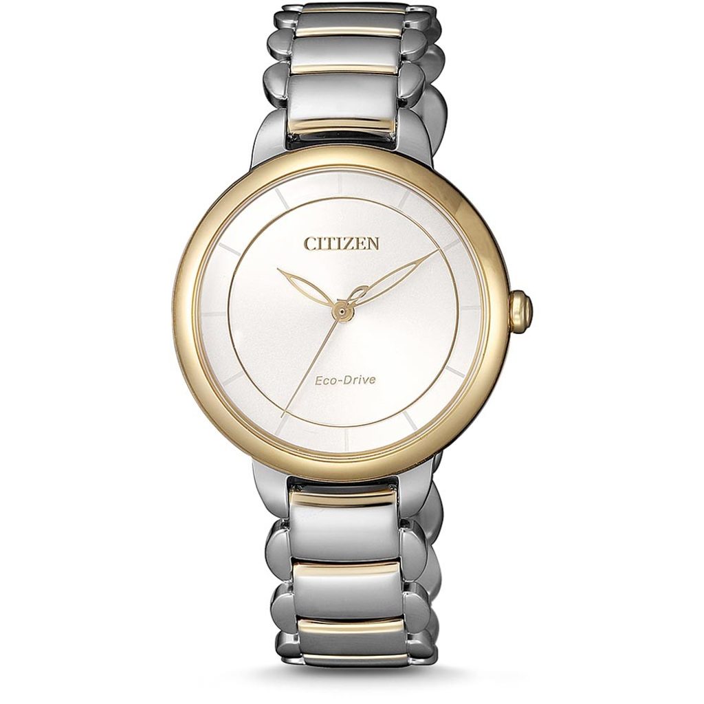 The Citizen L EM0674-81A watch has a case including the bracelet made of stainless steel with a partial PVD finish in gold. Inside the case, the in-house Citizen E031 movement works reliably, featuring a light rechargeable battery with a power reserve of up to 6 months and also has a discharge indicator function.