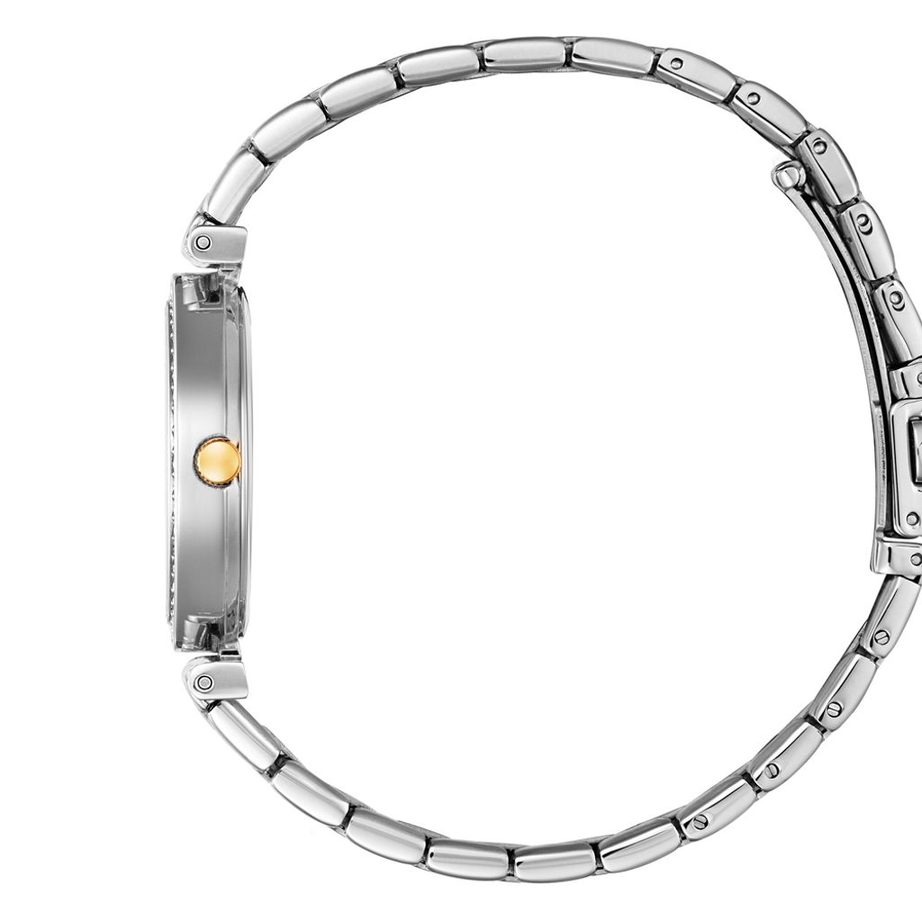The Citizen ER0216-59D watch has a case including the bracelet made of stainless steel with a partial PVD gold finish. Inside this case we find a Japanese Citizen 9633 quartz movement, powered by a battery. The elegance of this model is enhanced by the 44 Swarovski® stones placed along the entire lunette.