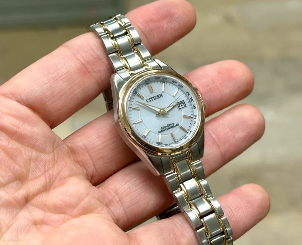 The case of the Citizen EC1170-85E is made of stainless steel with a partial gold-coloured PVD finish, as is its bracelet. Inside the case works the in-house Citizen H246 movement, which offers absolutely accurate time and date thanks to the Radio-Controlled system, i.e. synchronizing the time using a radio signal. Other features can also be relied on, such as preventing overcharging, warning when the watch is undercharged with two-second jumps of the second hand, or switching to power-saving mode in the dark. The date display function at the traditional third-hour position is very practical. This model is powered by Eco-Drive technology, a light-charged battery with a power reserve of up to 6 months (36 months in power-saving mode). This eliminates the need to replace the battery.
