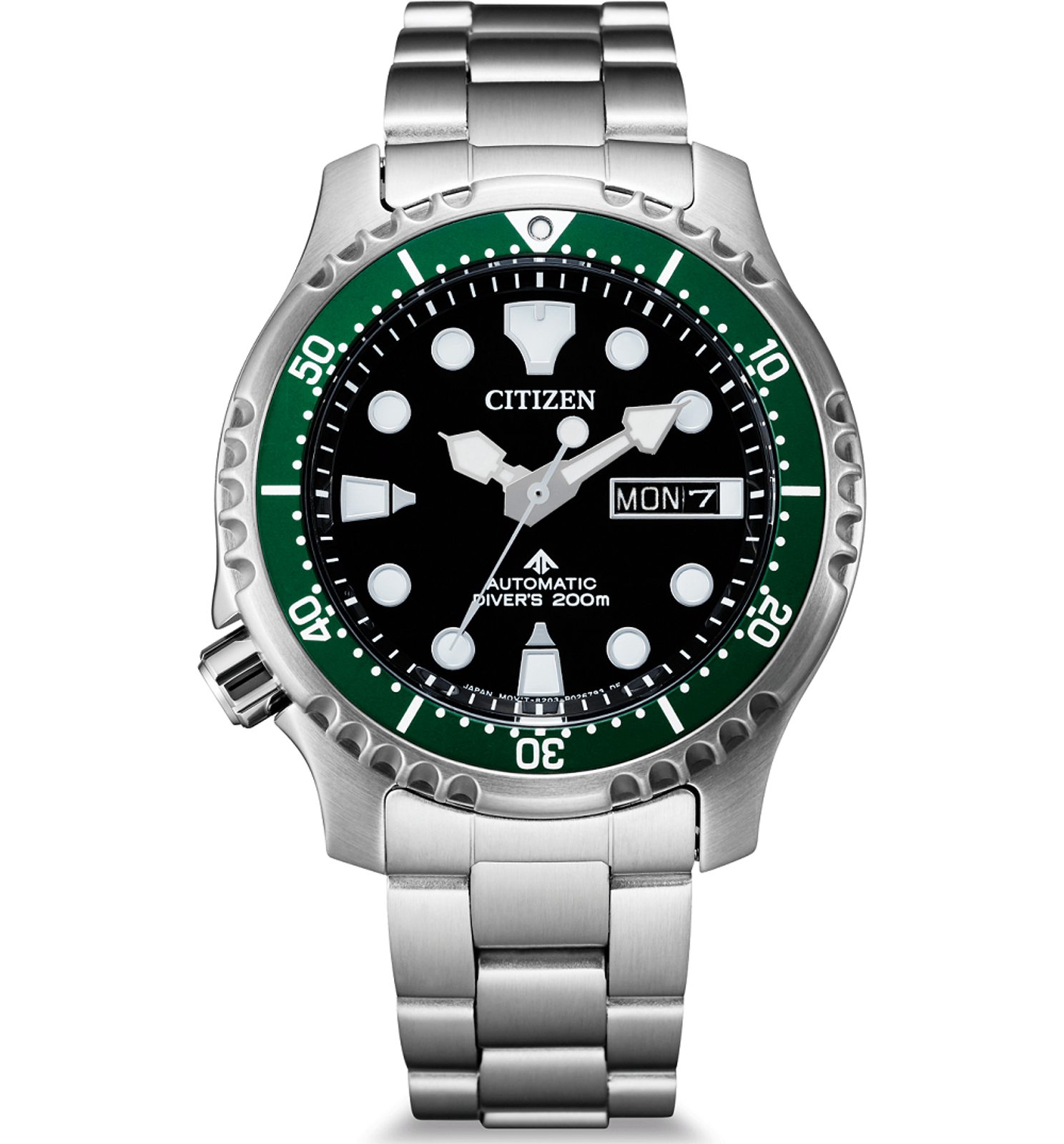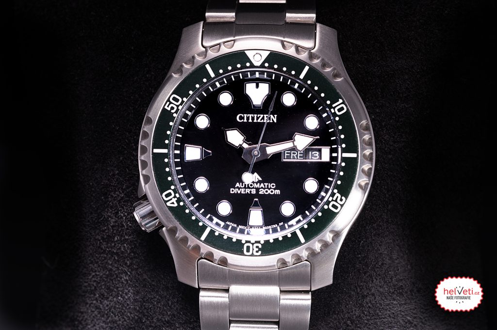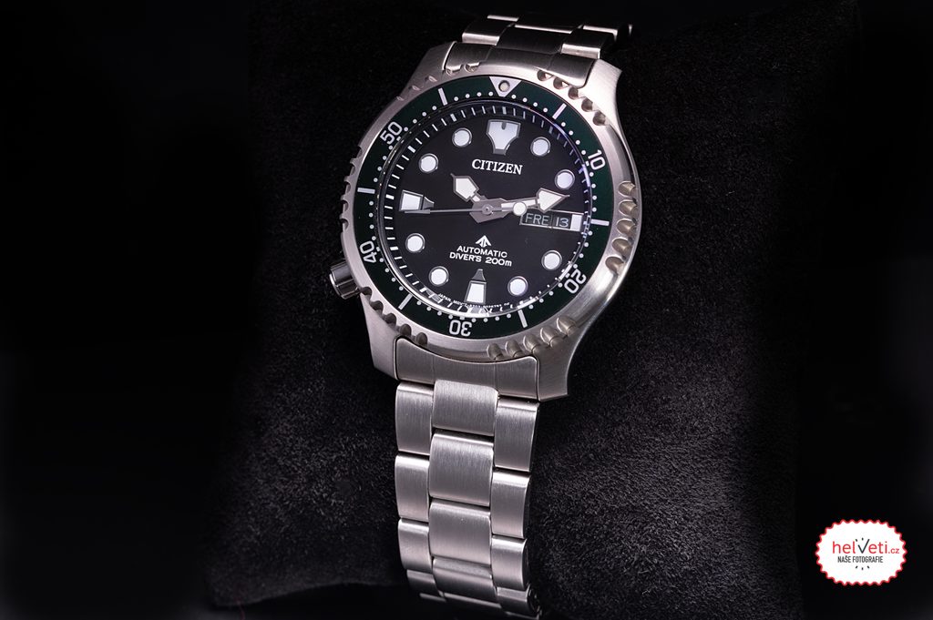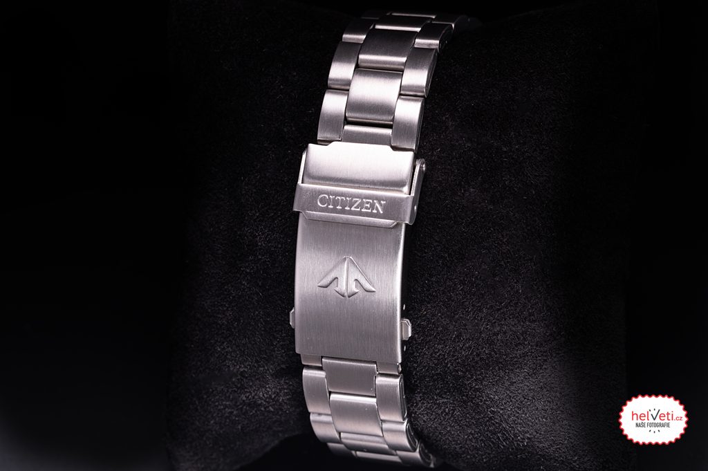 The Citizen NY0084-89EE including braceletis made of stainless steel and houses a mechanicalin-house movement Citizen 8203 with automatic winding (some pieces have the 8204 movement with a hacking function - stopping the second hand when ordered). It operates at frequency 21600 semi-frequencies per hour (3Hz) and has 21 stone fits. This movement also has a Parashock system (a Citizen invention), which increases the movement's resistance to shocks and impacts. A practical feature is the date and day of the week display, which is located at the traditional 3 o'clock position. An interesting feature of this model is the crown, located unconventionally at the 8 position. This makes it comfortable to wear, as the crown does not press into the wrist when the hand moves. Last but not least, this is an interesting feature for users who wear the watch on their right hand, as they can operate the crown more comfortably with their left hand.