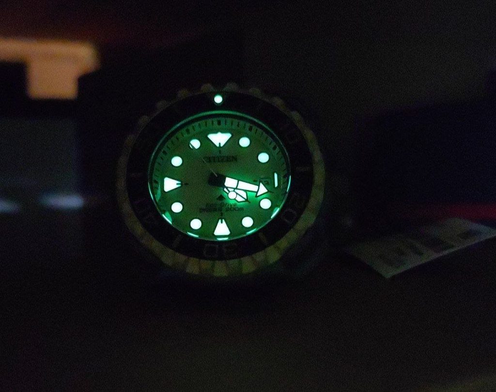 The water resistance of the Citizen Promaster Marine Divers BN0226-10P is 200 m and is therefore suitable for use in water, including swimming or diving. The water resistance is supported by a screw-down crown. This model even meets the ISO 6425 diving standard, which can be clearly read from the "Divers" inscription on the dial. This means, for example, declared resistance to magnetic fields, testing at 125% of the claimed water resistance value, or the need for a unidirectional rotating diving lunette. Improved legibility in low light conditions is provided by luminescence applied to the indices and hands.