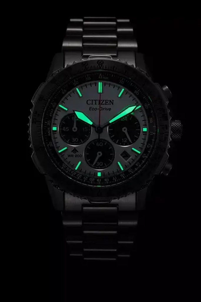The case including the bracelet of the Citizen Promaster Sky Chrono CA4660-61A is made of stainless steel. Inside this case works the in-house movement Citizen B620, which has a light rechargeable battery with a power reserve of up to 9 months and also has a low battery indicator function. Its other features are a stopwatch, a twenty-four hour sub-dial and a date display at the 4-5 o'clock position. An interesting feature of the stopwatch is the smooth operation of the second hand, which allows the time to be measured with an accuracy of 1/5th of a second.
