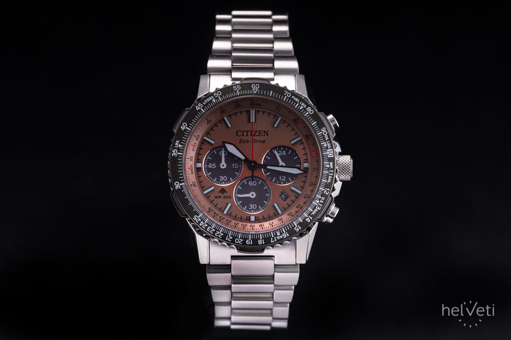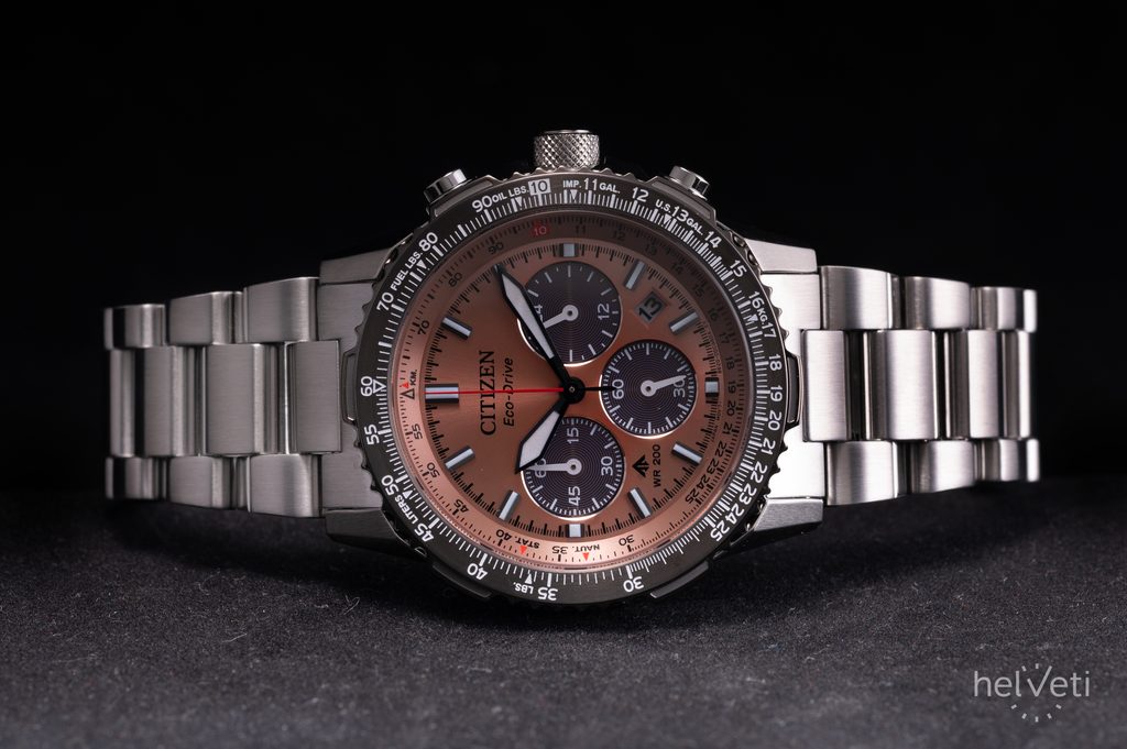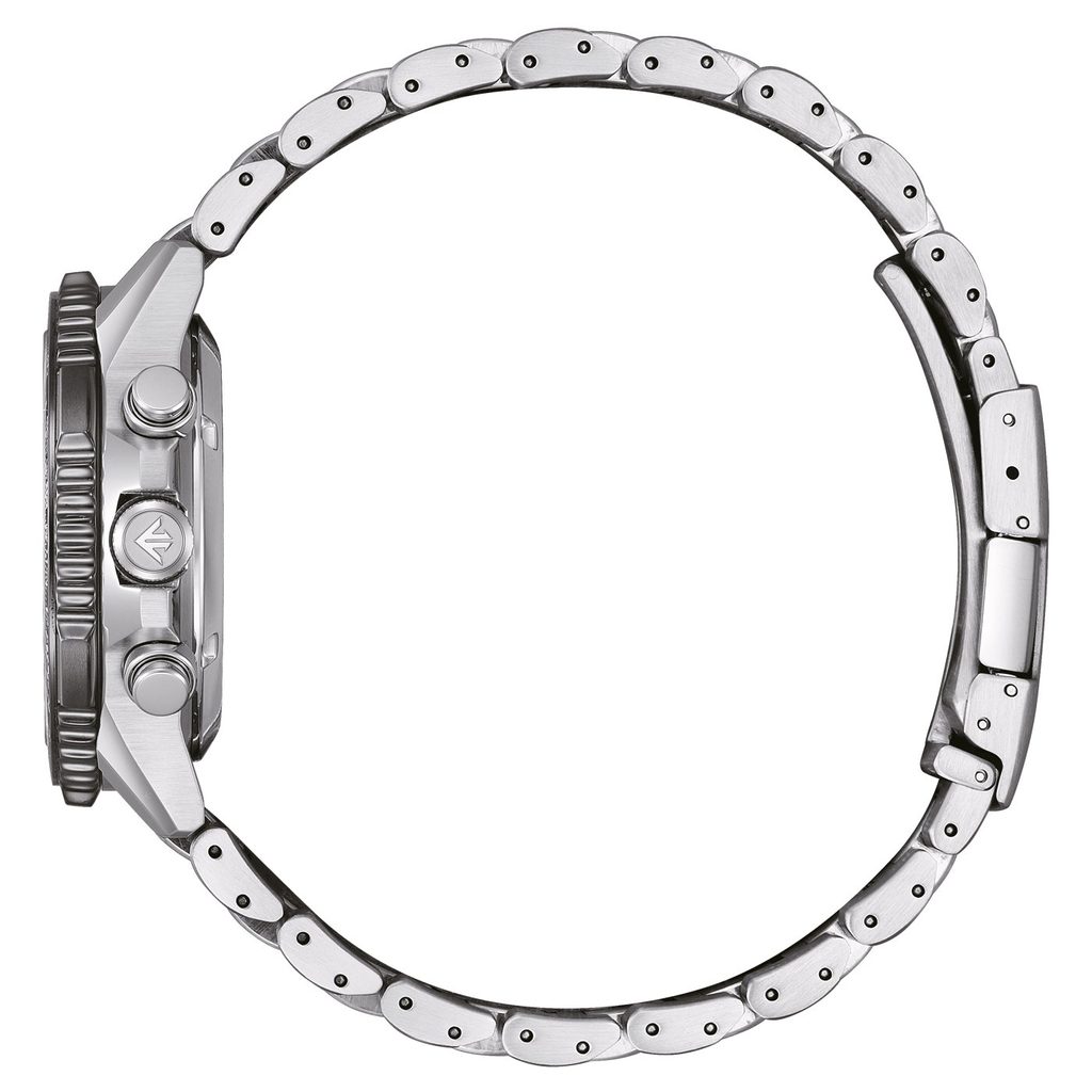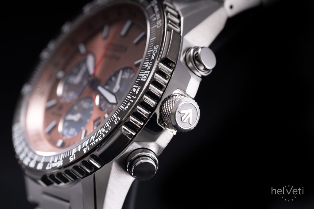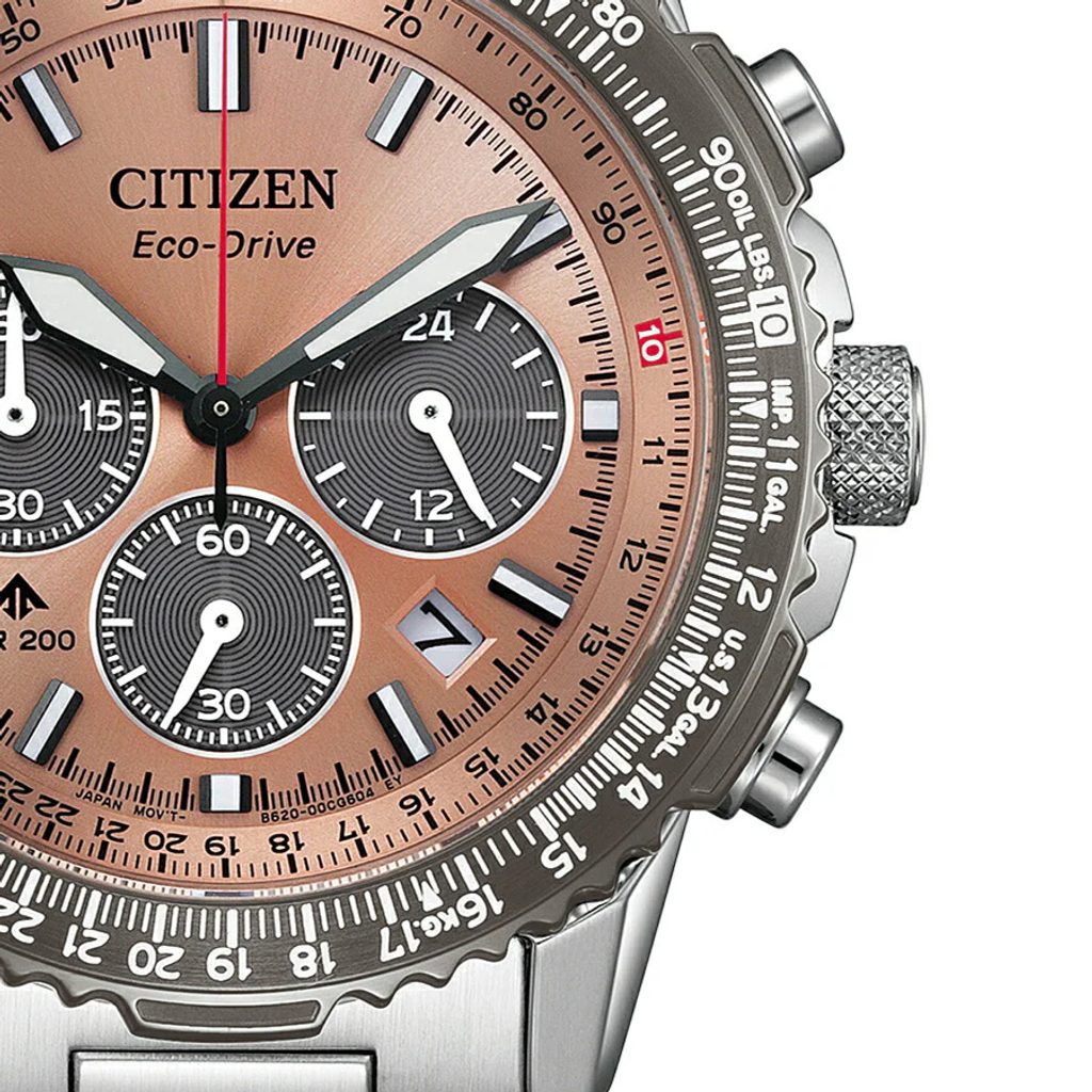 The case including the bracelet of the Citizen Promaster Sky Chrono CA4664-60X is made of stainless steel. Inside this case works the in-house movement Citizen B620, which has a light rechargeable battery with a power reserve of up to 9 months and also has a low battery indicator function. Its other features are a stopwatch, a twenty-four hour sub-dial and a date display at the 4-5 o'clock position. An interesting feature of the stopwatch is the smooth operation of the second hand, which allows the time to be measured with an accuracy of 1/5th of a second.