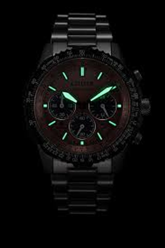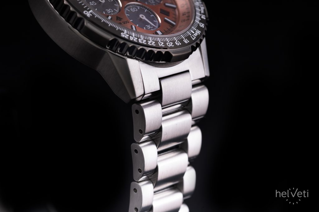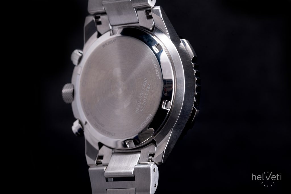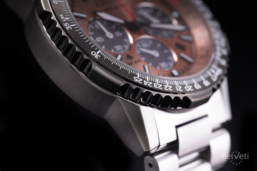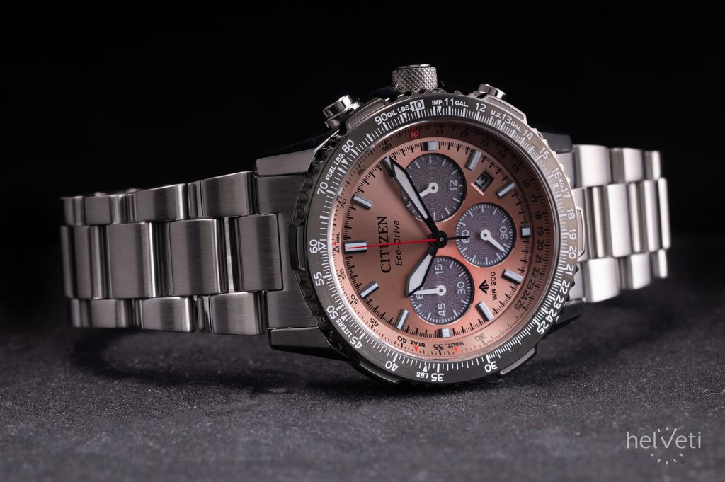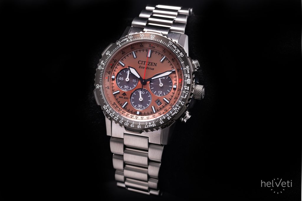 The case including the bracelet of the Citizen Promaster Sky Chrono CA4664-60X is made of stainless steel. Inside this case works the in-house movement Citizen B620, which has a light rechargeable battery with a power reserve of up to 9 months and also has a low battery indicator function. Its other features are a stopwatch, a twenty-four hour sub-dial and a date display at the 4-5 o'clock position. An interesting feature of the stopwatch is the smooth operation of the second hand, which allows the time to be measured with an accuracy of 1/5th of a second.