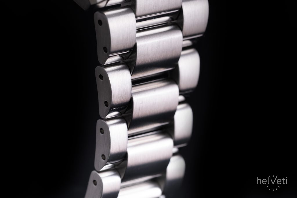 The clear dial is protected by a sapphire crystal that is maximally scratch-resistant. The anti-reflective coating ensures excellent legibility even in bright sunlight. The water resistance ofthis watch is200 m, so it can easily handle contact with water, such as swimming or diving up to about 20 meters. The water resistance is supported by a screw-down crown.