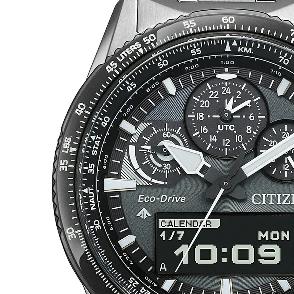 The Citizen JV2006-55H watch has a case including the bracelet made of stainless steel. Inside the case hides the in-house movement Citizen U830, which has a light rechargeable battery with a runtime reserve of up to 12 months (in power saving mode up to 3 years, i.e. 36 months) and also a low battery indication function. The machine has its analogue and digital part, which brings a lot of useful functions. The sub-dial at the ten o'clock position serves as a minute counter at the stopwatch, or a charge reserve indicator. The sub-dial at twelve o'clock shows the UTC time. The stopwatch measures time up to 24 hours. On the two-way rotating lunette we find a slide rule, used by aviators to calculate the amount of fuel remaining.
