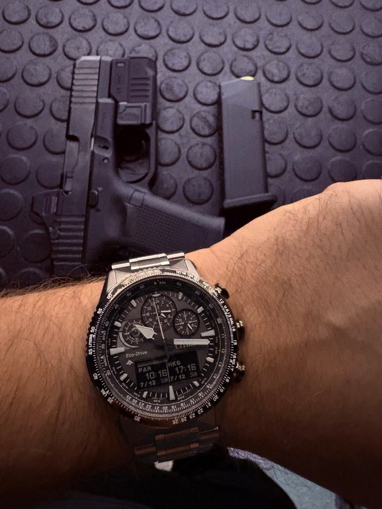 Of the revolutionary Citizen watch technologies, you are sure to know Eco-Drive, which stands for solar-powered watches. Both artificial and natural light pass through the dial and charge the battery via the solar cell, which drives the watch movement. The reserve charging period is 6 months, and when stored and not carried, it can be up to 7 years in hibernation mode. Other Citizen technologies: radio-controlled watches (Skyhawk AT), voice-controlled watches and much more.