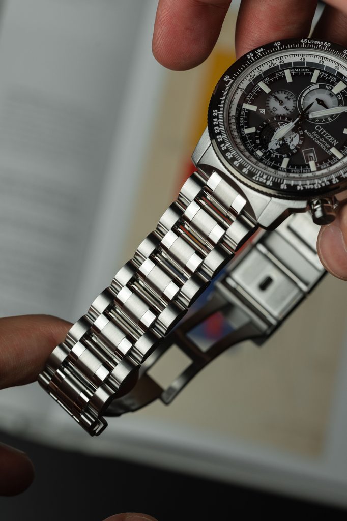 The case of the Citizen BY3006-53H is made of stainless steel, as is its bracelet. Inside this case works the Citizen H864 movement, which offers absolutely accurate time thanks to the Radio-Controlled system, i.e. synchronizing the time using a radio signal. Other features can be relied on, such as battery indication, preventing overcharging, warning when the battery is undercharged with two-second jumps of the second hand, or switching to power saving mode. You can also use the stopwatch function with 1/20 s accuracy, or the 24-hour sub-dial at the 9 o'clock position. Very practical is the date and day of the week display. At the 6 o'clock position we find the Northern Hemisphere subdial, where the arrow shows the UTC time and the approximate times in the Northern Hemisphere regions can be read. The two-way rotatable slide rule can also be used for simple slide rule calculations.