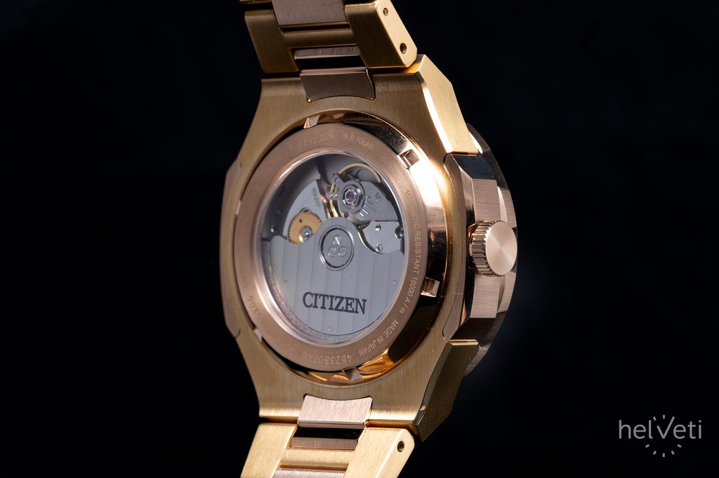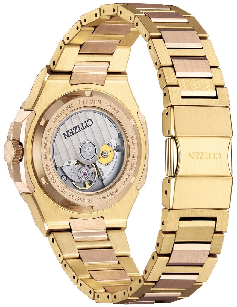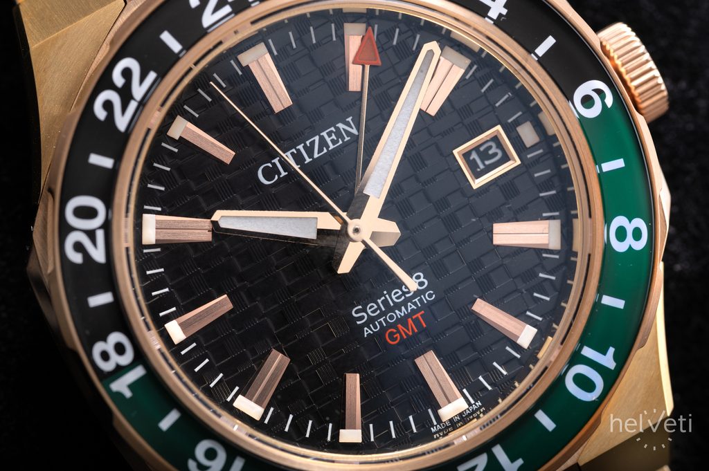 The Citizen Series 8 880 GMT Automatic NB6033-51E has a case and bracelet made of stainless steel with a PVD finish in rose gold. Inside the case is the Citizen 9054 mechanical in-housemovement with automatic winding, which was first used by Citizen in 2023. This movement operates at a modern frequency of 28,800 semi-frequencies per hour (4Hz) and has 24 stone fits. It also features a "Hacking" function, i.e. stopping the second hand when the watch is regulated, and the option of manual winding with the crown. Thanks to the increased resistance of the movement to magnetic fields, this model has a resistance to magnetic fields of a very respectable 16,000 A/m ( the resistance of a conventional watch is around 4,800 A/m) The movement also has a Parashock system (a Citizen invention), which increases the resistance of the movement to shocks and shocks. The movement's operation can be observed through a transparent dial. Travellers will benefit from the GMT function - i.e. a second time zone indicator in the form of a fourth hand. In addition, it is a so-called True GMT, where the GMT hand moves with the time setting and the adjustment of the main hour hand then takes place in leaps of one hour, while the home time on the GMT hand remains unchanged. There is also a bi-directional rotating GMT lunette that allows the time to be read in an extra time zone. A handy feature is the date display, which is located at the traditional 3 o'clock position.