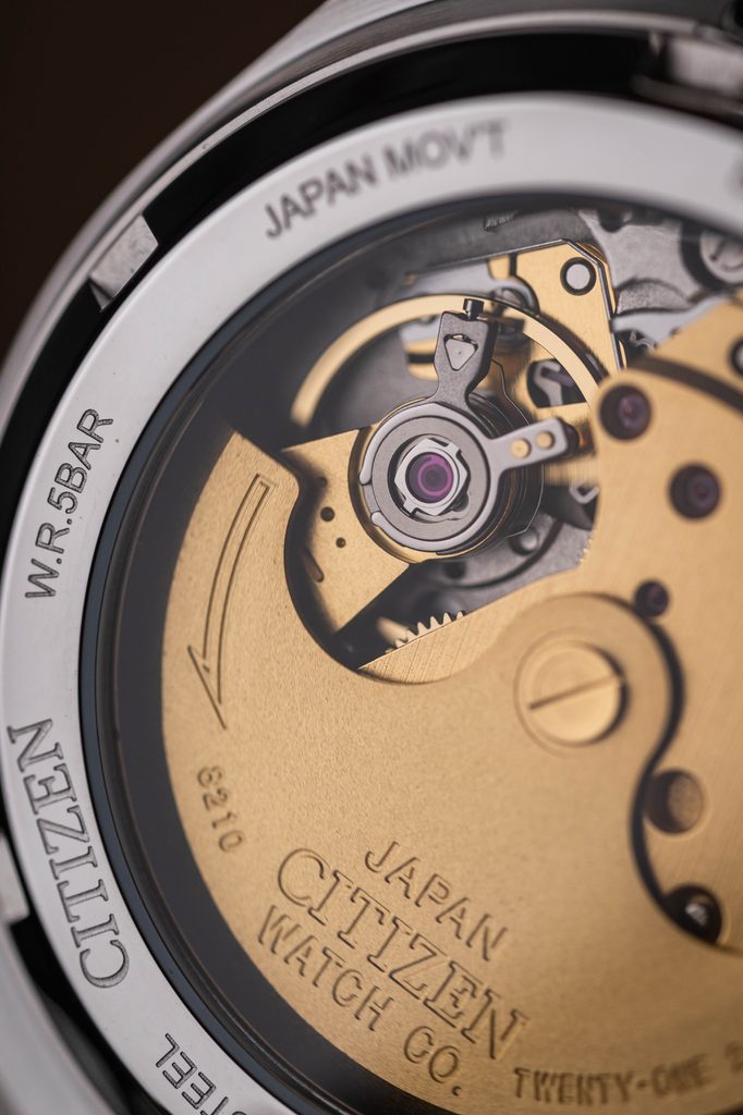 The Citizen NJ0200-50M watch has a case made of stainless steel, which is complemented by an integrated steel bracelet. Inside the case we find the Citizen 8210 mechanical in-house movement with automatic winding, which can also be wound manually by the crown. This movement operates at a frequency of 21,600 semi-frequencies per hour, features 21 jewels and a date display at the traditional position 3. Its legibility is enhanced by a magnifying glass on the slide - the so-called "Cyclops". The movement's operation can be observed thanks to the transparent dial.