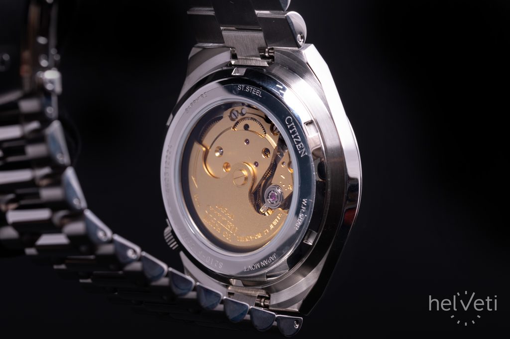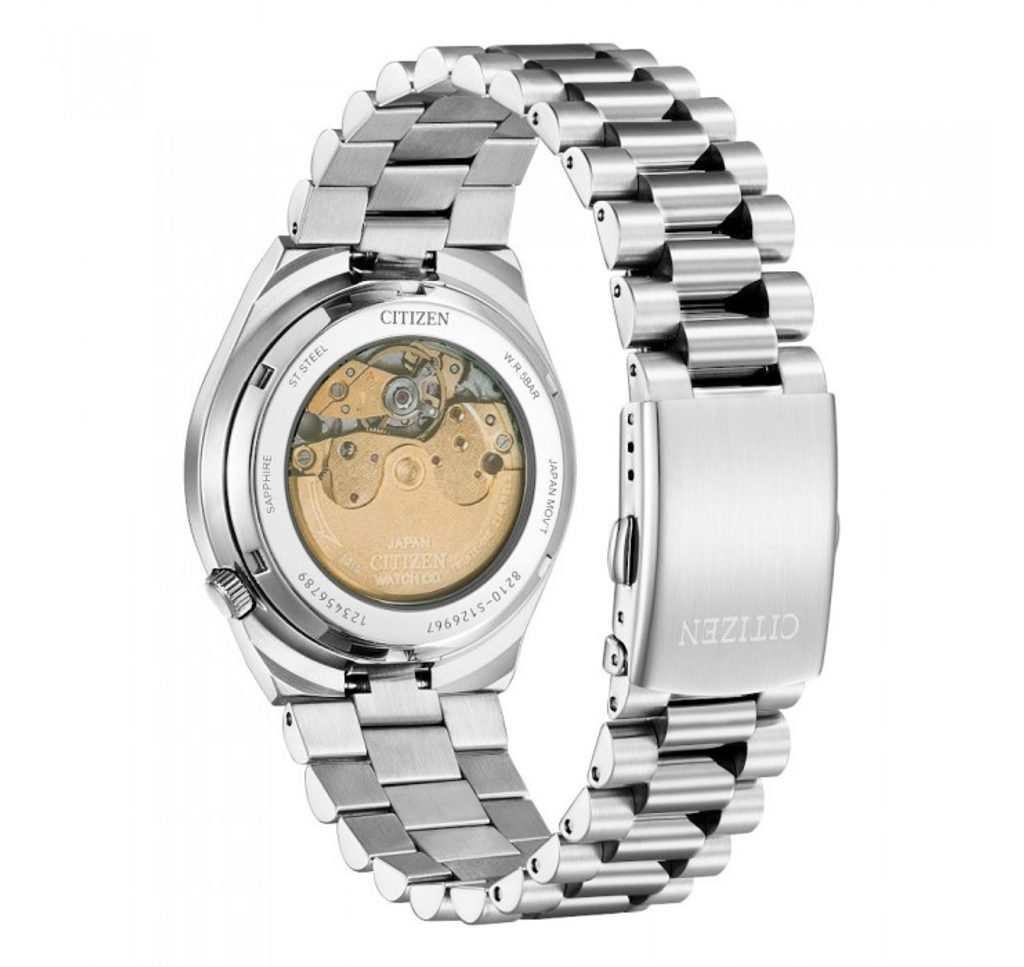 The Citizen NJ0151-88W watch has a case made of stainless steel, which is complemented by an integrated steel bracelet. Inside the case we find the Citizen 8210 mechanical in-house movement with automatic winding, which can also be wound manually by the crown. This movement operates at a frequency of 21,600 semi-frequencies per hour, features 21 jewels and a date display at the traditional position 3. Its legibility is enhanced by a magnifying glass on the slide - the so-called "Cyclops". The movement's operation can be observed thanks to the transparent dial.