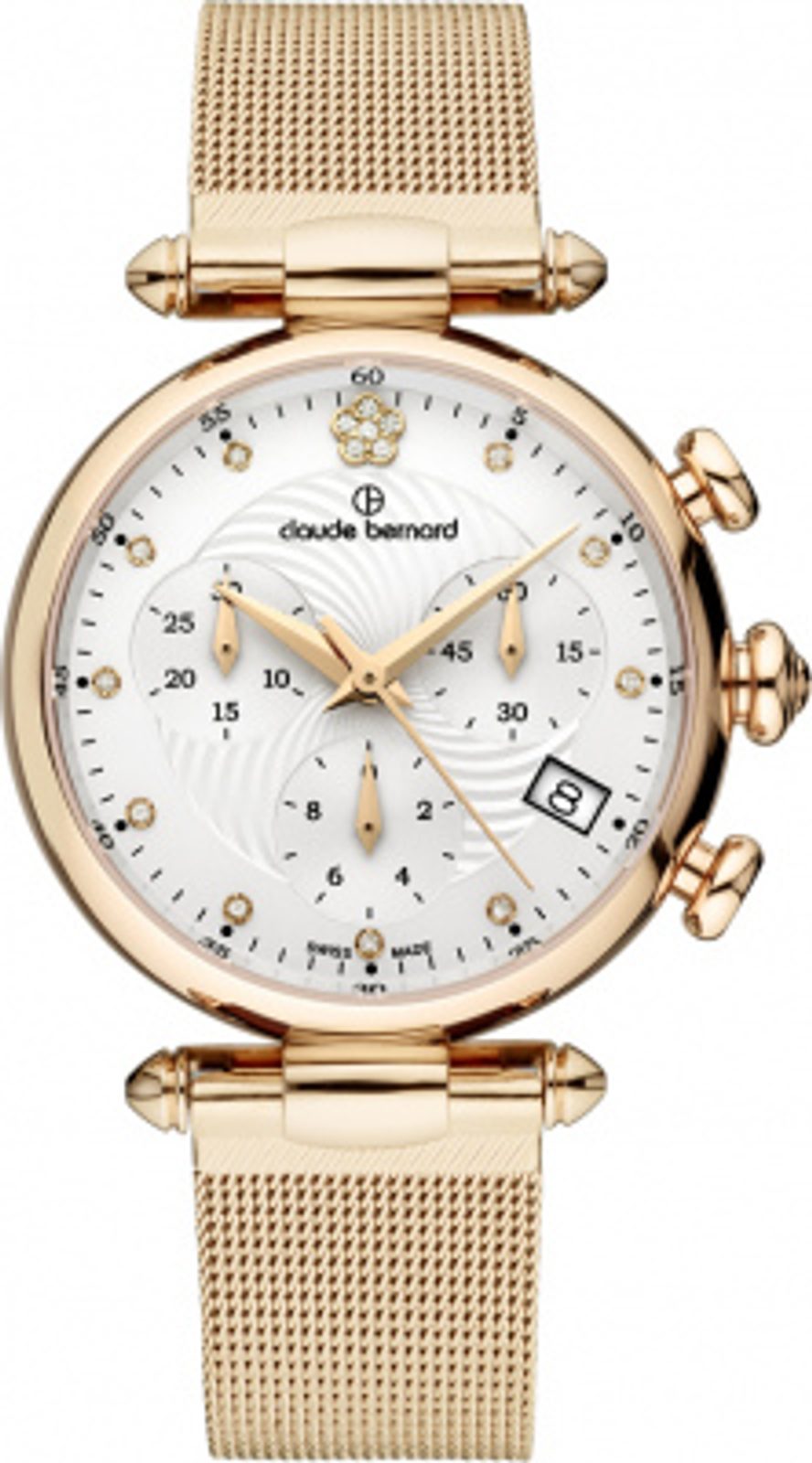 Women's Claude Bernard Dress Code 10216 37R APR2. Swiss battery-operated quartz movement works inside. Which is in an elegant stainless steel case with a PVD finish in gold. The elegant mother-of-pearl dial is decorated with shiny cubic zirconia. This model has a chronograph (stopwatch) on the sub-dials at 3,6 and 9 o'clock. There is a date display at the 4 position of the dial