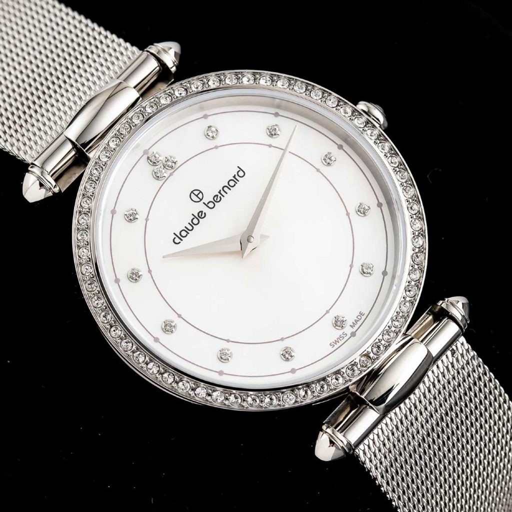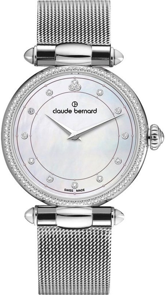 Women's model of Claude Bernard Dress Code 20509-3M-NAN.The Claude Bernard Dress Code 20509-3M-NAN is powered by a battery-operated quartz RONDA 762 movement. Which is in an elegant stainless steel case and lunette decorated with Swarovski crystals, which is also decorated with a pearl elegant dial where Swarovski crystals are in place of the index.