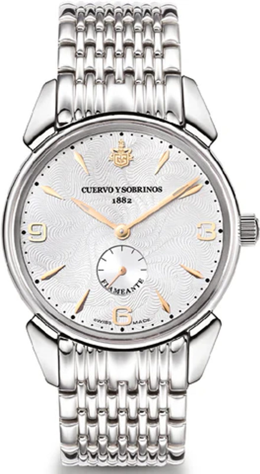 The case of the Cuervo y Sobrinos Historiador Flameante 3130B.1S-MON is made of stainless steel. Inside is a Swiss mechanical movement with manual winding CYS 2052 (based on the ETA 7001). It is set with 17 jewels and boasts a power reserve of 42 hours. The movement's operation can be enjoyed thanks to a transparent sapphire crystal dial.