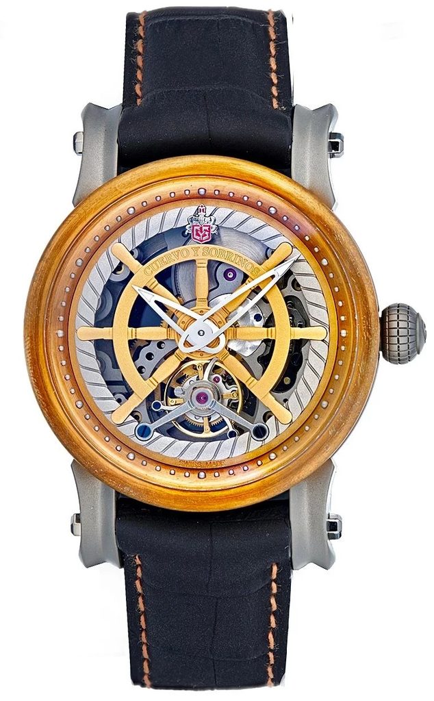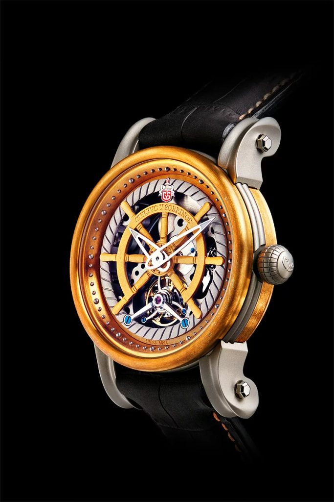 The assembly of the movement and its subsequent regulation requires the expertise of a master watchmaker. The Pirata Tourbillon is housed in a 45 mm bronze and titanium case. The bronze components take on a patinated appearance with age. In addition, the combination of the aforementioned metals makes the case look unobtrusive and provides the perfect foil for the dial to stand out. The dial celebrates Cuba's rich maritime history with its distinctive ship's wheel design.