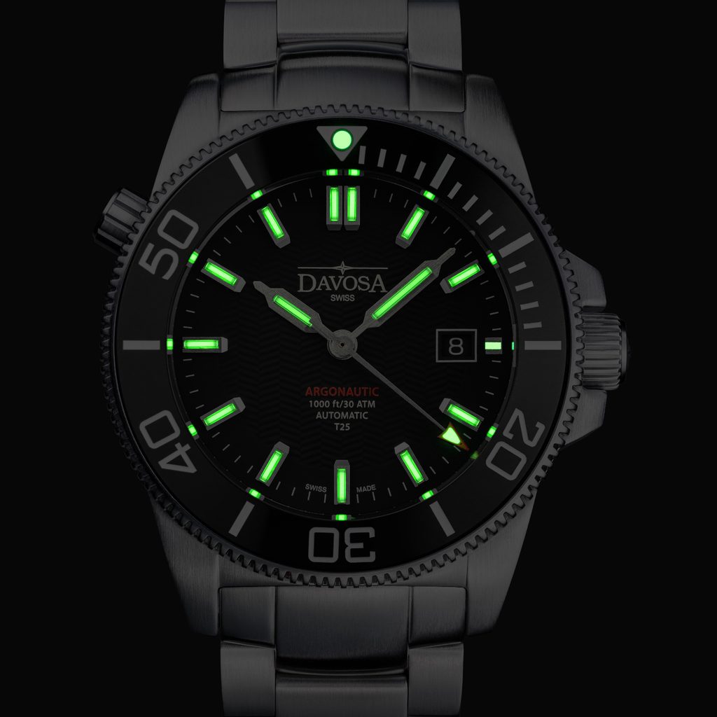 The latest version of the Argonautic Lumis has 66% better luminosity than the previous model. The tritium tubes glow green in the dark, a color that the human eye perceives particularly well in low light conditions. These so-called tritium gas light sources, or GTLS, are not only extremely safe, but also guarantee that the watch will last the wearer at least ten years of constant illumination - without an external power source.