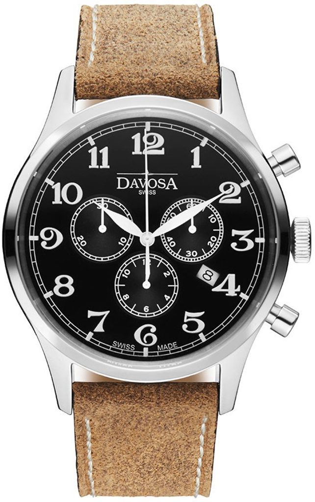 Davosa Heritage 162.479.56. A model that dusts off the look of a watch from the good old days. The shape of the hands and the font of the numerals take us back a few decades. However, thanks to its size and "vintage" leather strap, it will also impress in today's hectic times. In terms of watch functions, this model offers a date display at the 4th position and a stopwatch. The glass of the watch is made of durable sapphire, which just won't scratch anything. Water resistance is 5ATM.