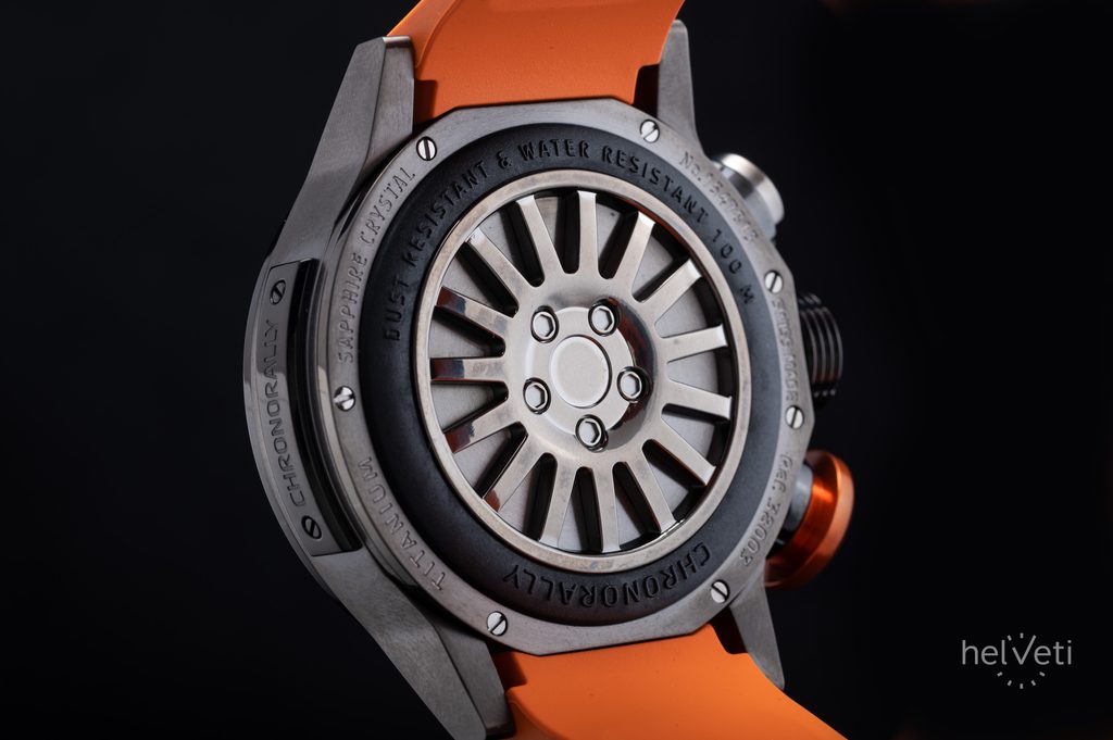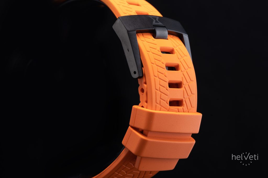 The case is made of titanium in a silver finish and is completed with a black rubber strap with a tyre pattern. The water resistance of this model is 100m, so the watch can withstand the occasional surface swim and shower. The diameter of the case is 45 mm, so it is a rather large watch.